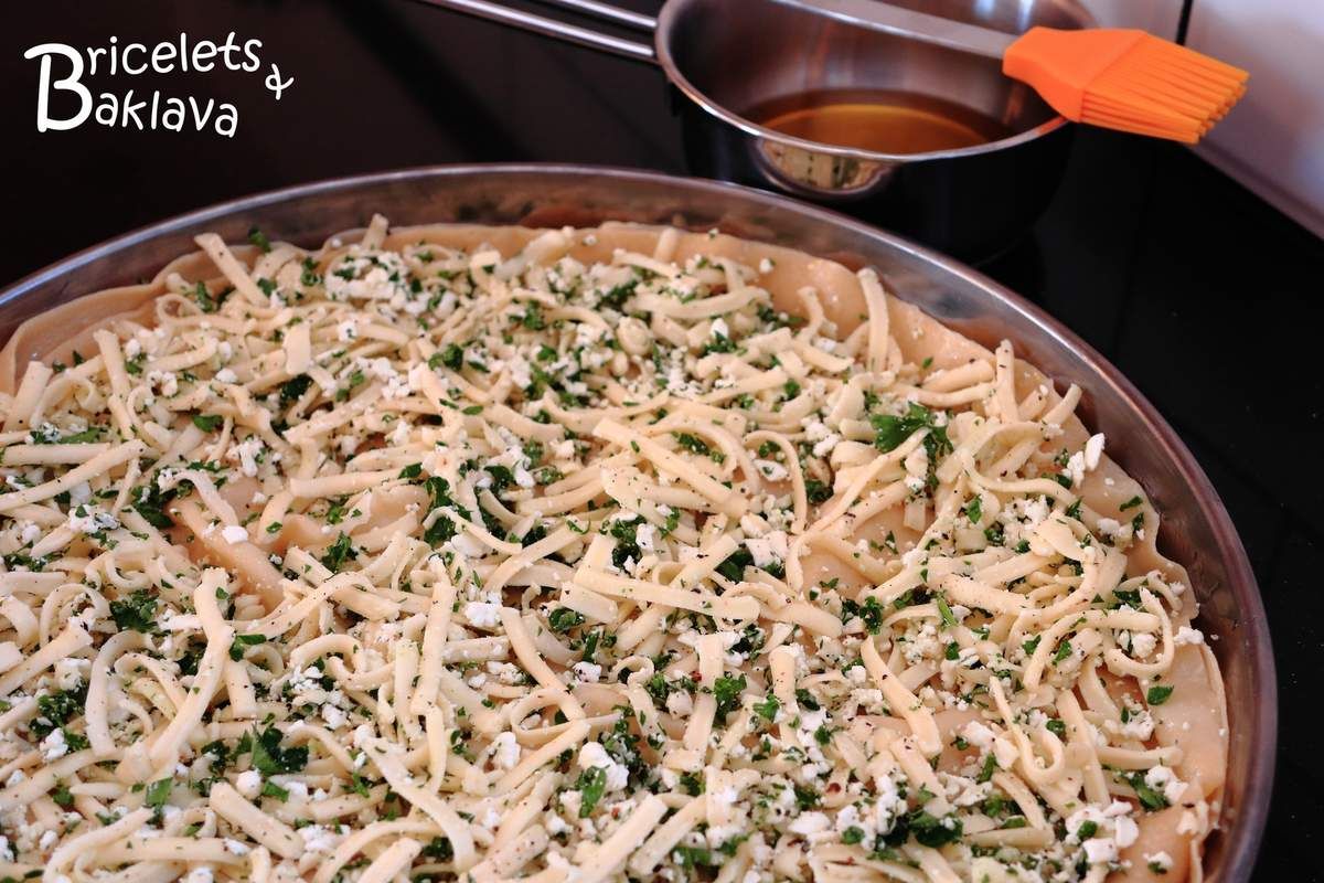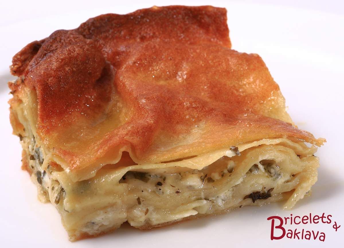 En fait, il s’agit d’une sorte de lasagne à base de pâte à nouille avec comme farce au milieu, un mélange de fromages et du persil. On choisira du fromage frais, moulé et non affiné, genre mozzarella ferme à râper, de la féta pour apporter la touche orientale et du Parmesan, pour donner un peu de caractère. Un plat absolument divin.