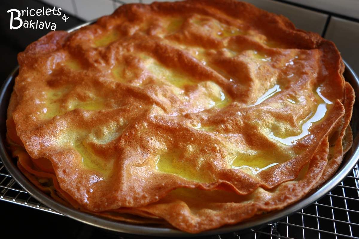 Terminer le montage avec les 3 autres couches restantes sans oublier de beurrer chacune d’elle. Beurrer aussi le dessus, car c’est avec l’action de la chaleur que celui-ci deviendra délicatement croustillant.