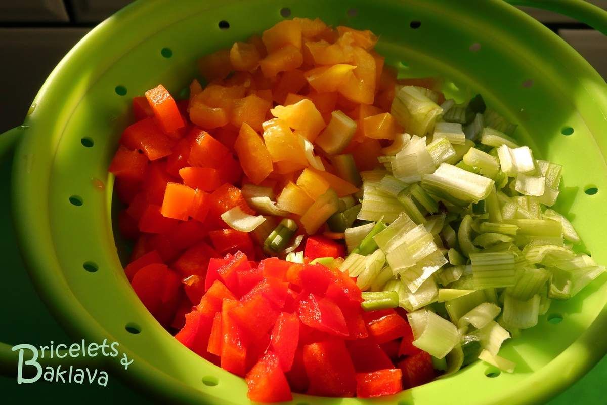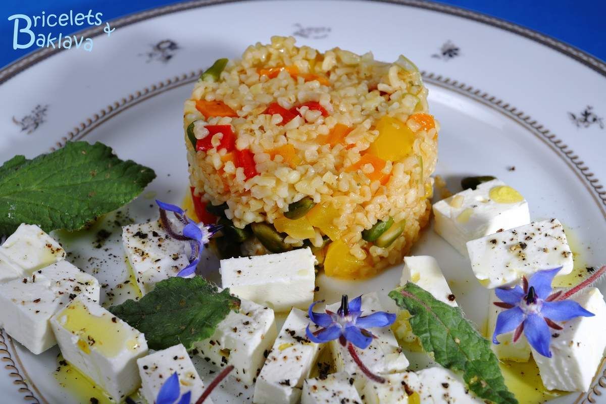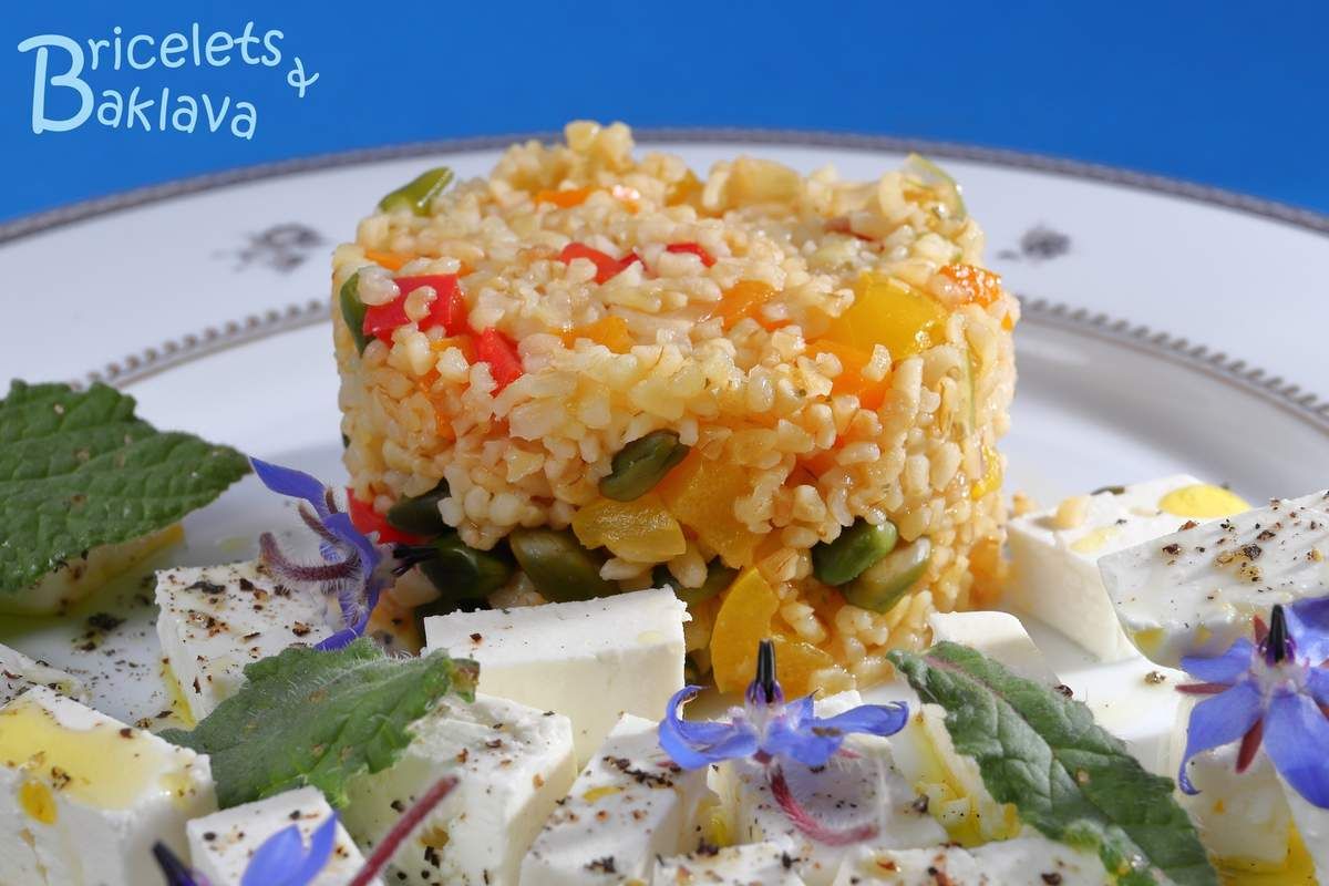 Une autre version du pilaf de boulgour, très coloré, plein de saveur et de légèreté et qui peut se servir comme accompagnement de n’importe quoi, mais en particulier des grillades. On peut même le proposer comme plat principal avec une salade mixte, quelques cubes de feta et une baguette croustillante, superbe.