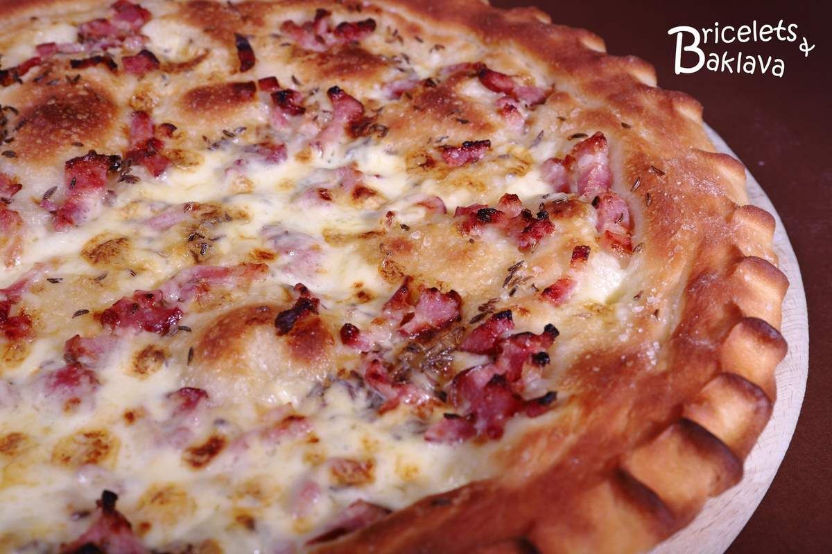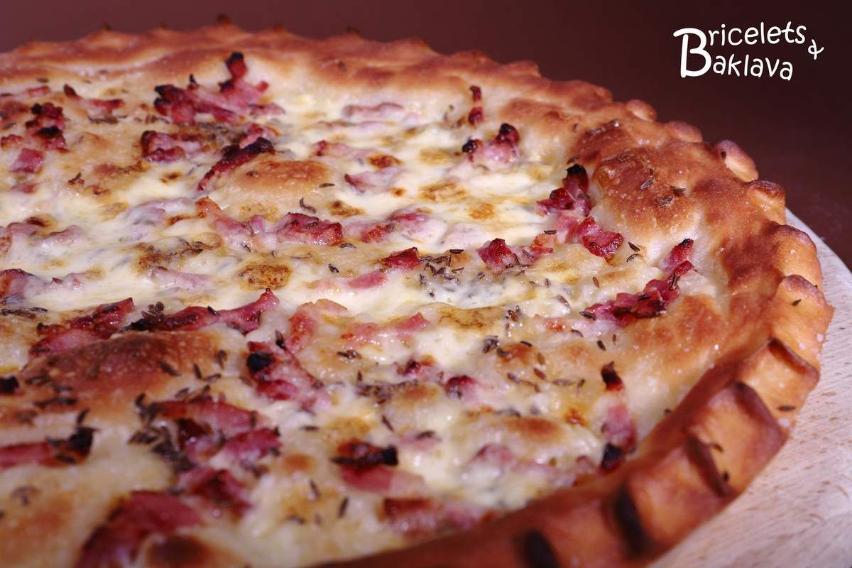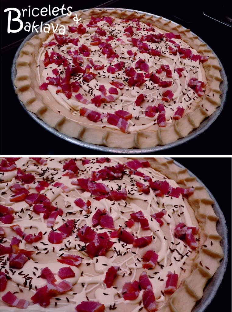 Répartir les lardons, ajouter un peu de graines de carvi, une pincée de fleur de sel et mettre au four préchauffé à 220-230°C.