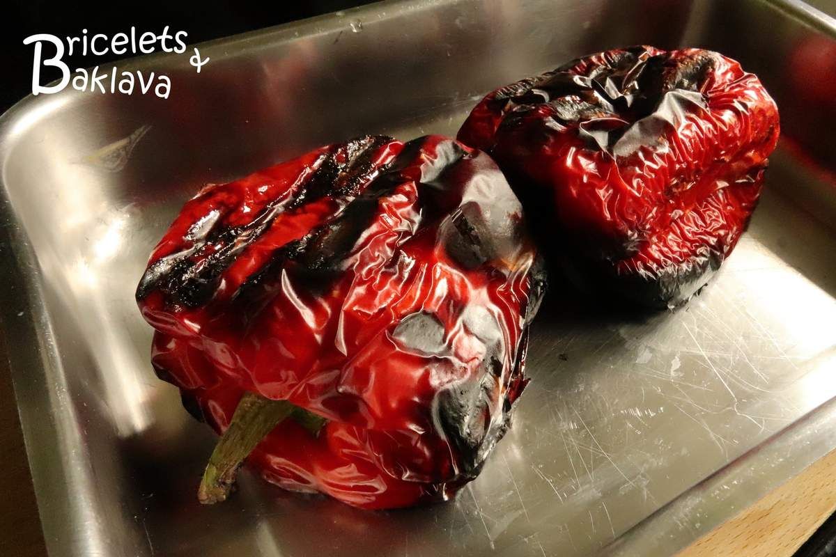 Lorsque les poivrons sont grillés, voire presque brûlés, les refroidir puis les peler.
