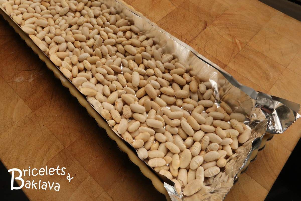 Pour la cuisson à blanc, découper du papier alu à la grandeur du moule et l’appliquer sur la pâte au préalablement piquée avec une fourchette. Le remplir de noyaux de cuisson ou de haricots secs afin que la pâte ne fasse pas de cloques.