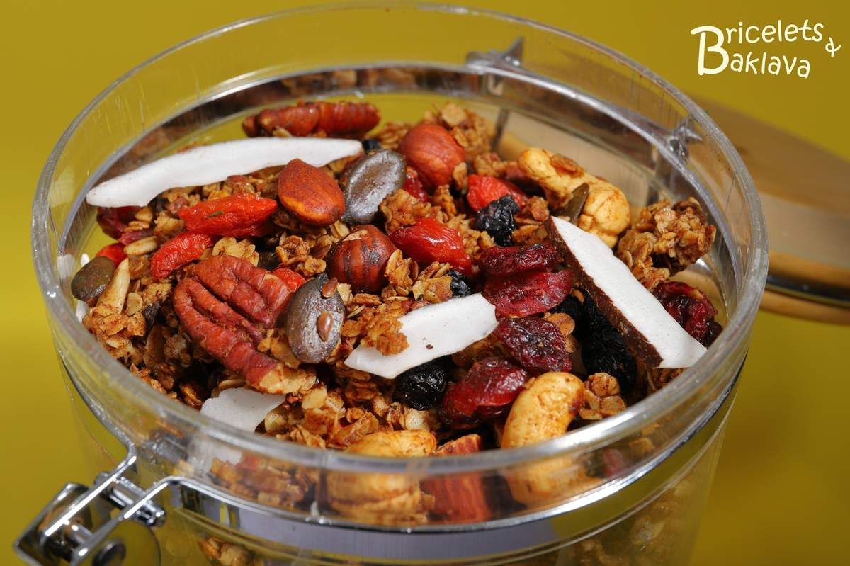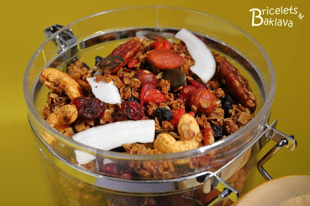 Il est bien entendu qu’à partir de cette recette de base vous pouvez jouer avec le mélange de noix, de fruit et d’épices pour en faire votre granola préféré.