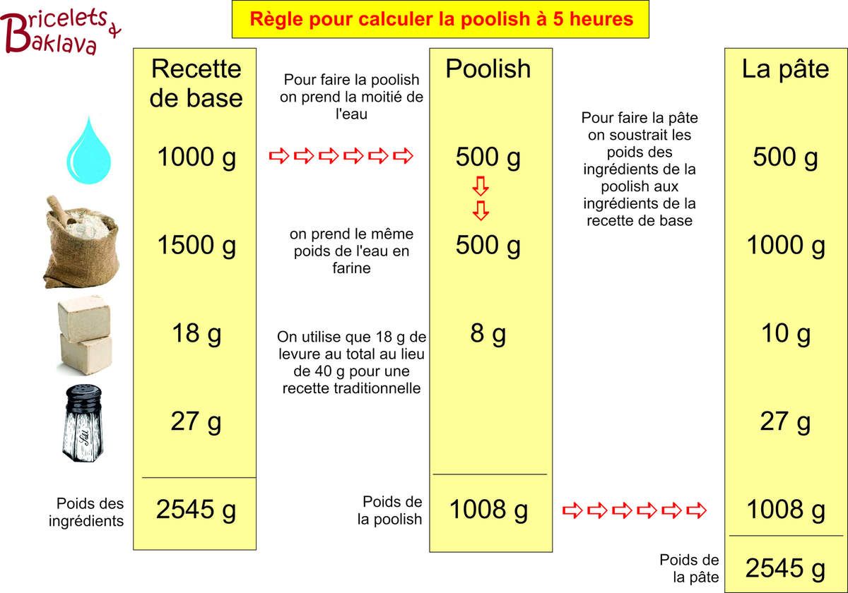 A la différence du levain, la poolish est plus ou moins liquide et démarre avec de la levure, dont la quantité varie en fonction du temps de fermentation et de la température du lieu. En général, il faut compter entre 5 et 8 grammes de levure par kilo de farine, 5 grammes en hiver et 8 durant les canicules.