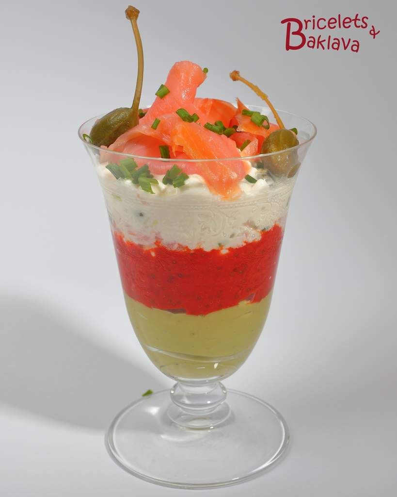 Voila le résultat, une mousse d’avocat citronnée, un coulis de poivrons grillés et assaisonné au paprika fumé, ce qui va apporter une note légèrement sucrée et pour terminer un mélange de cottage cheese et de saumon fumé, ceci pour la partie crémeuse et sommitale du plat.