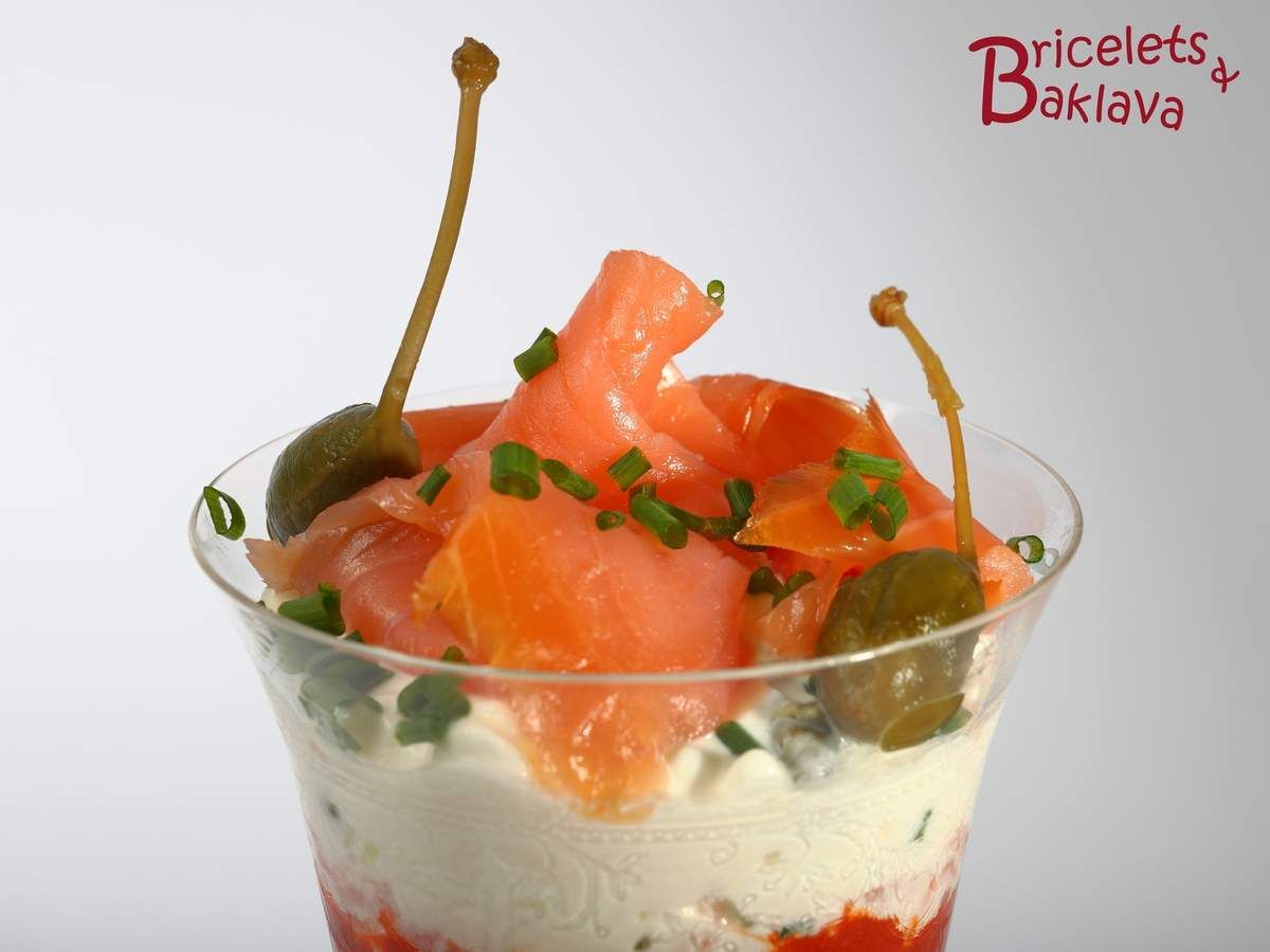 Verrine de saumon fumé et avocat mais pour notre repas académique je l’avais nommée « La trilogie écossaise au saumon fumé ». Pourquoi trilogie ? Pour ses trois étages bien sûr et « écossaise » ? Parce que le saumon venait d’Ecosse et que le troisième étage était aromatisé d’un whisky tourbé.