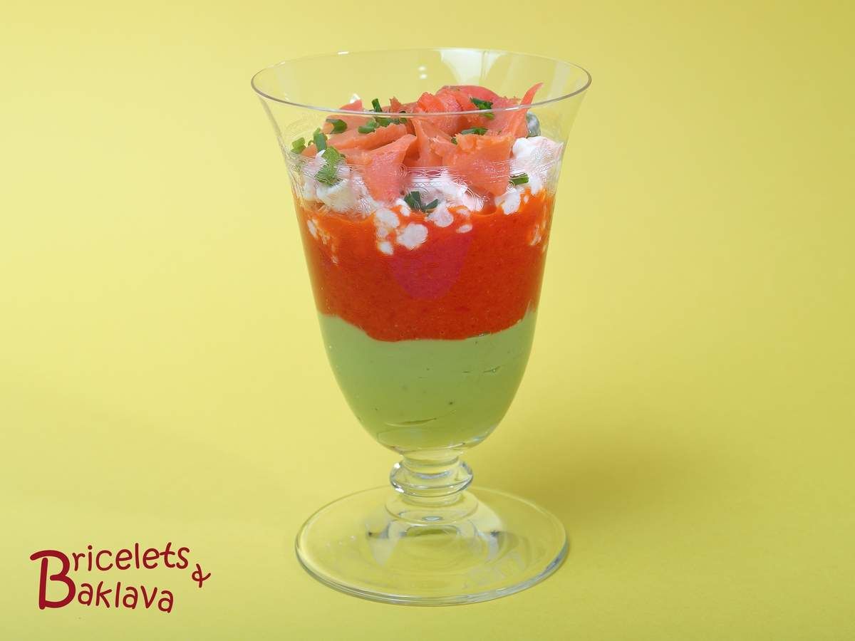 Dans les beaux verres que vous aurez choisis, déposer au fond le coulis d’avocat et par-dessus le coulis de poivrons.