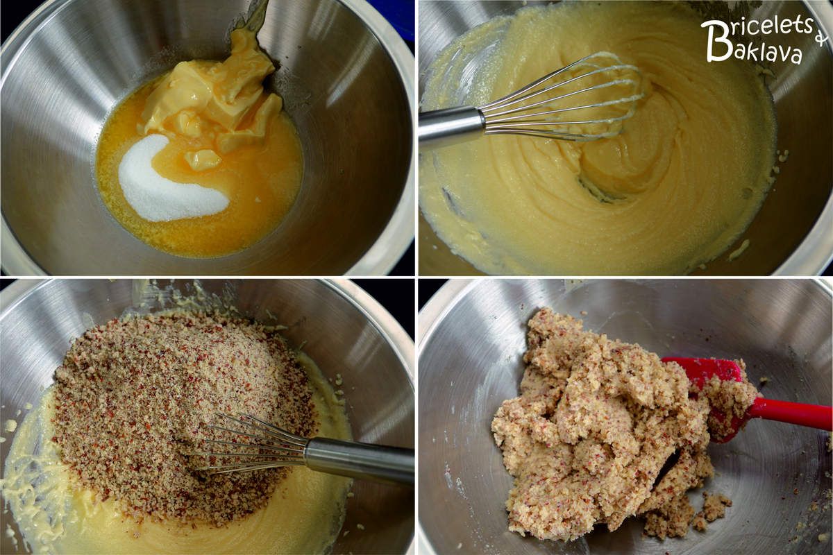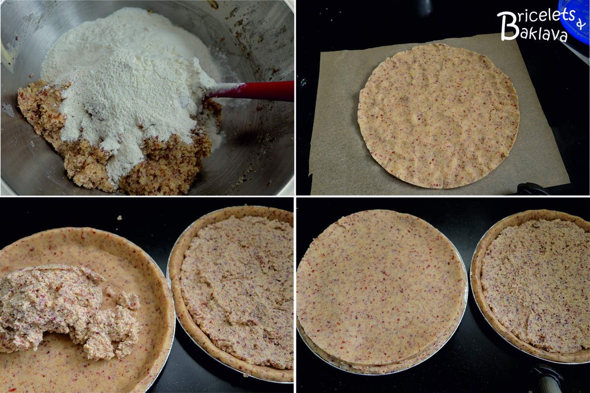La pâte est assez simple à confectionner et possède comme uniques ingrédients, en proportions égales, des noisettes, du sucre, du beurre et de la farine et cette pâte très friable va devoir emprisonner une subtile farce composée de noisettes et de crème fraîche. Encore une fois, chacun possède sa recette bien gardée, transmise depuis des générations, avec toutes les fantaisies possibles comme des œufs, du lait, de la crème, du vin blanc et j’en passe. Mais je vous assure, la proportion des ingrédients de la pâte doit être de quatre parts égales et ne contient en aucun cas un soupçon de liquide, c’est ce qui va donner cette texture croquante, délicate et friable. Et pour la farce, des noisettes et de la crème suffisent, le sucre est superflu, il y en a déjà assez dans la pâte.