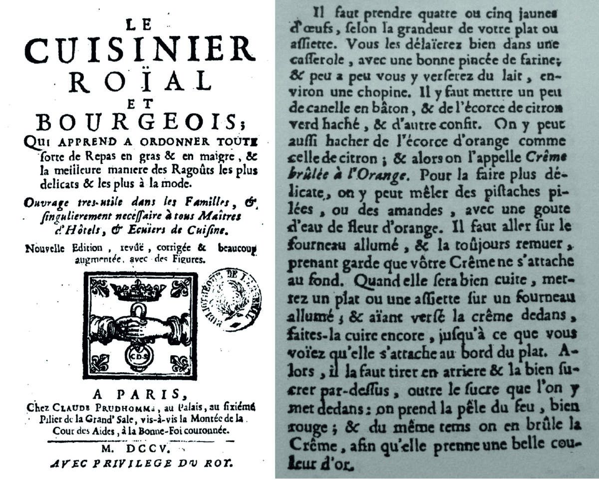 La crème brûlée est sans doute un des desserts les plus appréciés au monde mais c’est aussi lui qui remporte la palme d’or des variantes les plus originales et extravagantes possible, à faire retourner dans sa tombe le créateur de cette recette. C’est en 1691, de passage à Perpignan que François Massialot, cuisinier du roi, note les recettes des régions qu’il traverse dont sans doute celle de la crème catalane. Lors d’un repas, voulant réchauffer une crème froide destinée au petit Philippe d’Orléans, il utilise un fer brûlant sur la couverture de sucre qui caramélise aussitôt. Le jeûne roi a bien apprécié et en redemanda. La crème brûlée était née. Il en livre la recette dans son best-seller « Le Cuisinier Royal et Bourgeois », dont vous pouvez en lire ci-dessous un extrait :