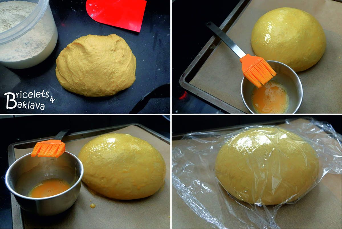 Sortir la pâte du pétrin et avec un peu de farine, en faire une boule et la déposer dans un saladier. Recouvrir d’une feuille de plastique ou d’un torchon humide et faire pousser pendant 1 heure à 1h30 à une température d’environ 28°C. La pâte devrait doubler de volume.