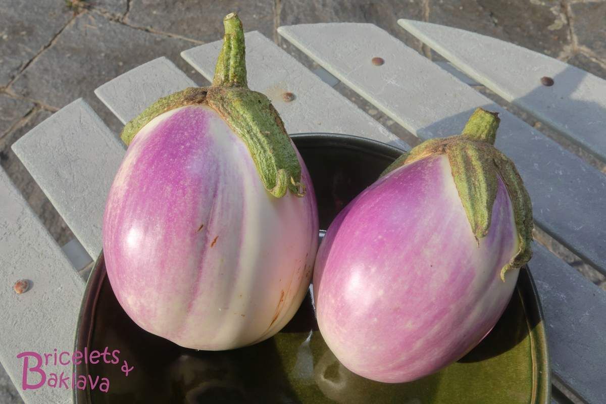 Peu calorique, l’aubergine est délicieuse à toutes les sauces. On en trouve maintenant de toutes les couleurs mais leurs goûts ne varient pas beaucoup. Pour la recette, j’ai utilisé des violettes parce que ce sont celles de mon jardin. Elles sont presque rondes, blanches et violettes et leur chair ferme ne contient que peu de pépins. Mais l’aubergine noir traditionnelle conviendra parfaitement.