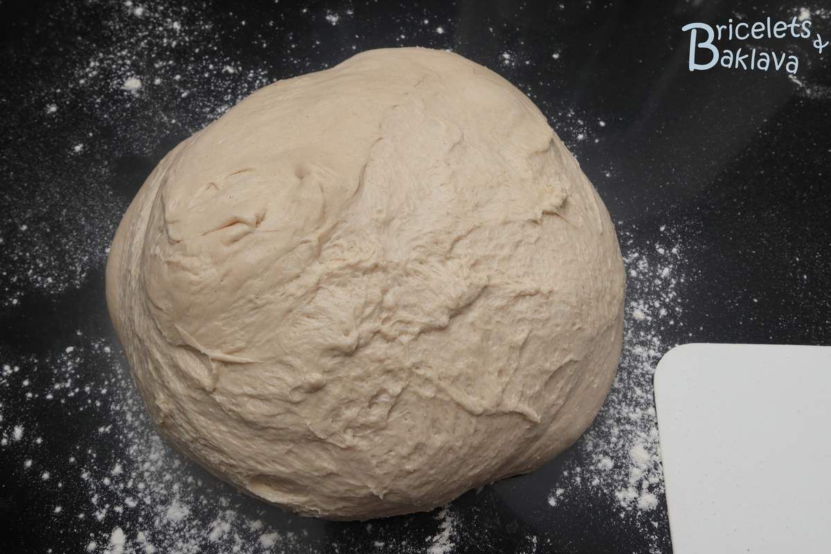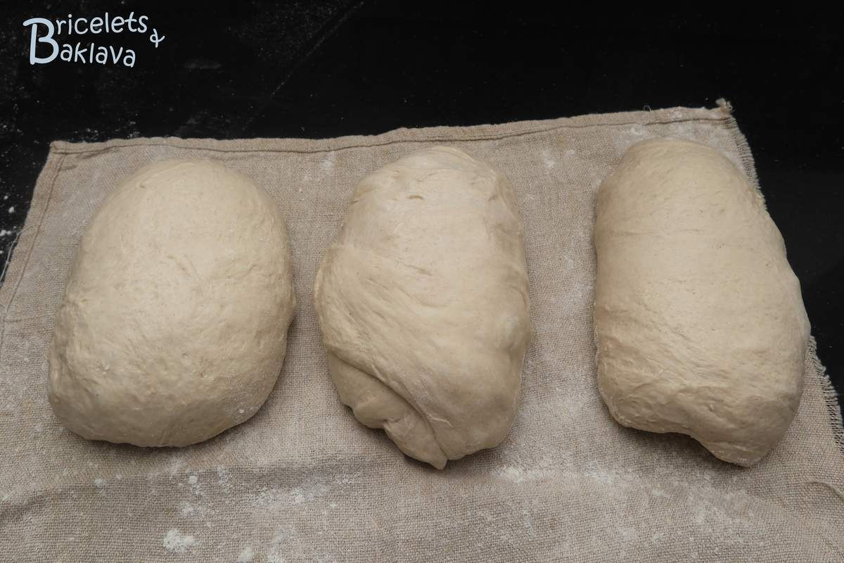 Transférer la pâte sur le plan de travail, la diviser en 3 pâtons et sans trop les manipuler, les façonner légèrement et très délicatement et les réserver sous un torchon pendant 10 à 15 minutes, c’est la détente. Pour le boulanger aussi, il peut boire son café.