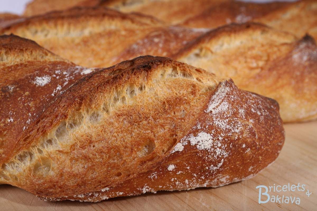 Les glisser (avec le papier cuisson) directement sur la pierre chaude ou la plaque chaude et n’oubliez pas de verser un verre d’eau au fond de votre four avant de fermer la porte, histoire de produire un peu de vapeur et les cuire 25 minutes à 240°C .