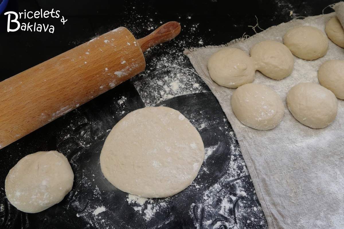 Abaisser les pâtons au rouleau, pour en faire des disques de 12 à 13 cm de diamètre. Il est important de bien fariner vos pâtons lors de cette opération. Remarque : plus vous abaisserez les pâtons, plus vous aurez une poche mince.