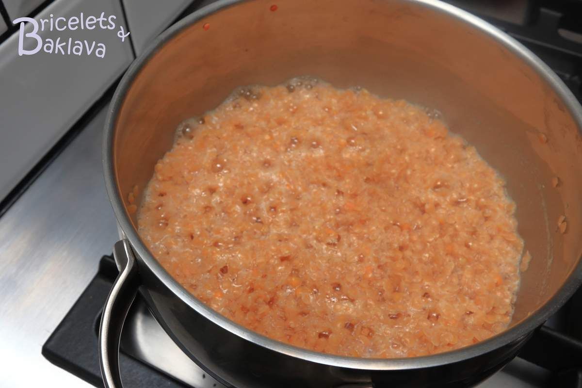 Allumer le feu et cuire les lentilles pendant 5 minutes dès le début de l’ébullition, elles devront être cuites, éclatées et fondantes, mais il devrait rester encore un peu de liquide.
