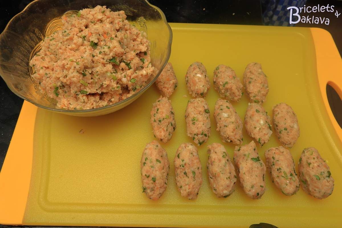 Bien malaxer le tout longuement et avec vos mains mouillées, façonner des boulettes ovales de la grandeur d’une grosse noix.