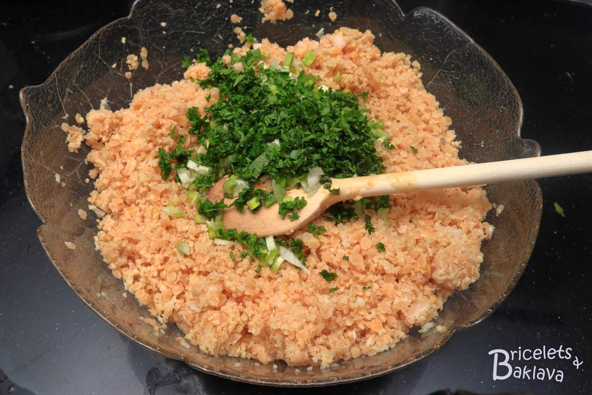 Voici une jolie petite recette « fraîcheur », arménienne et végétarienne, très facile à préparer et d’un coût ridiculement bas. Ces boulettes de lentilles et boulgour garniront à merveille vos mezzés ou entrées et pourront même être servies lors d’un apéritif.