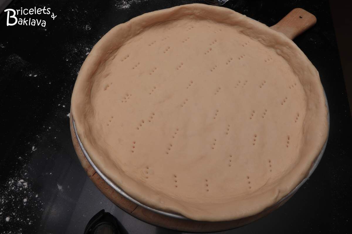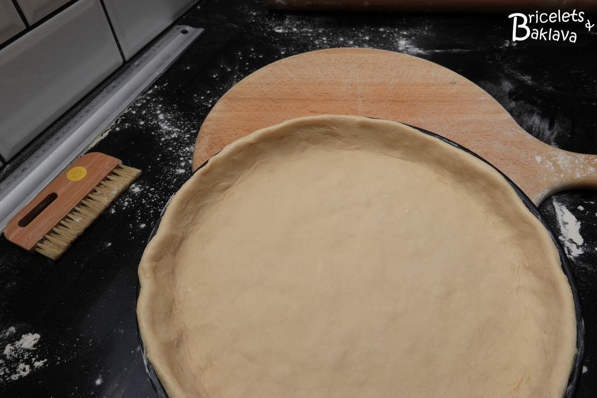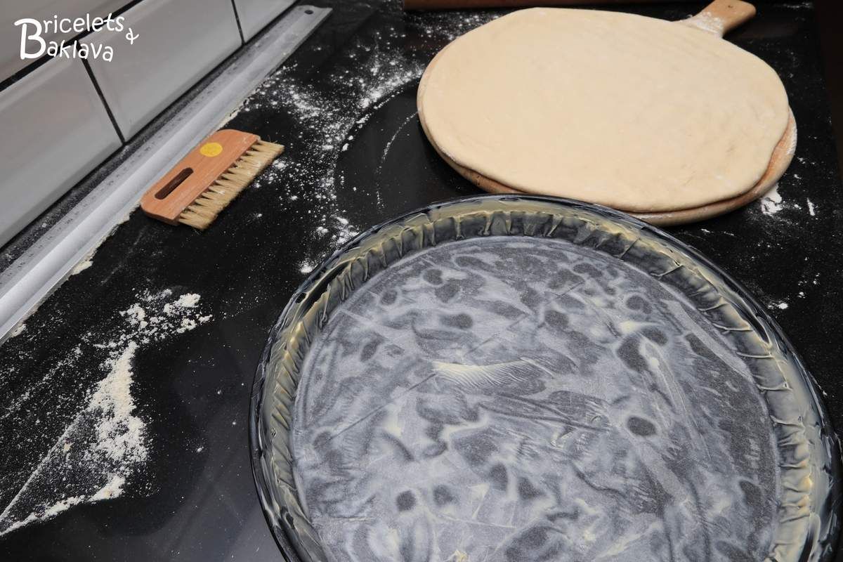 Abaisser le pâton avec les mains sur un foncet (planche ronde en bois) fariné et glisser l’abaisse dans la plaque préalablement beurrée.