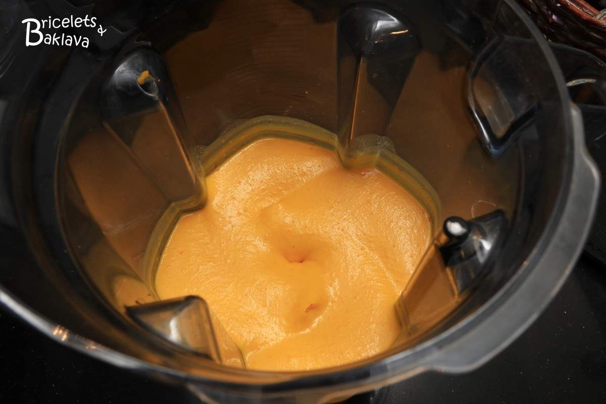 Mettre la chair de courge et la préparation de crème dans votre mixer et faire tourner à grande vitesse afin d'obtenir une belle crème onctueuse. Réserver le temps de préparer les lardons.