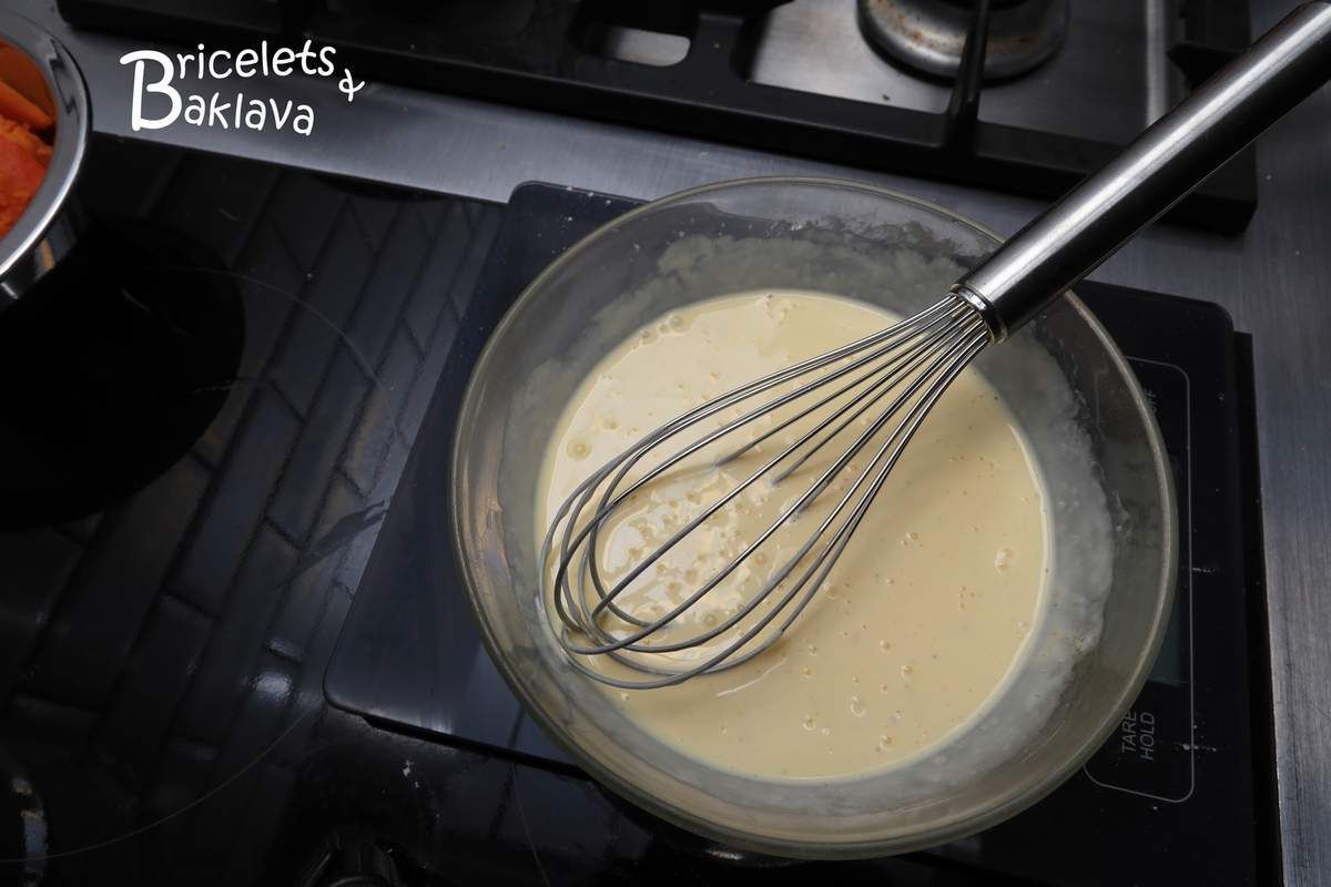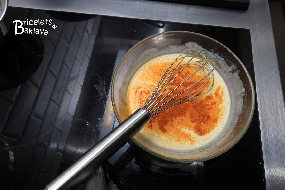 Ajouter le curcuma à la crème et bien le dissoudre. Le curcuma va relever la couleur jaune, il en faudra deux belles pincées mais quand même pas trop car il ne faut pas qu'il domine le goût de la courge. Le mieux est de goûter votre préparation.
