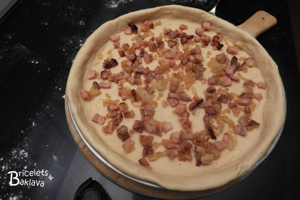Ensuite, répartir les lardons et les oignons sur le fond de pâte qui à ce moment-là aura bien levé et que vous aurez piqué avec une fourchette.