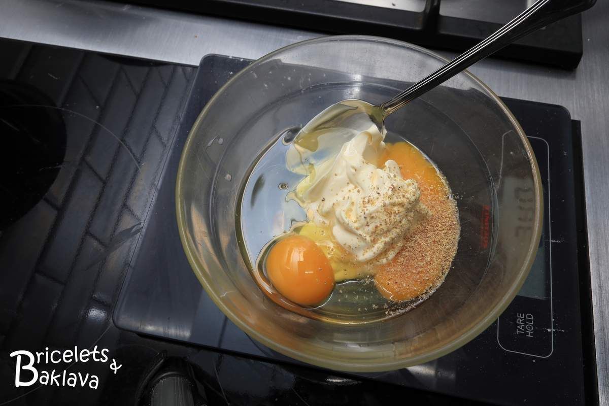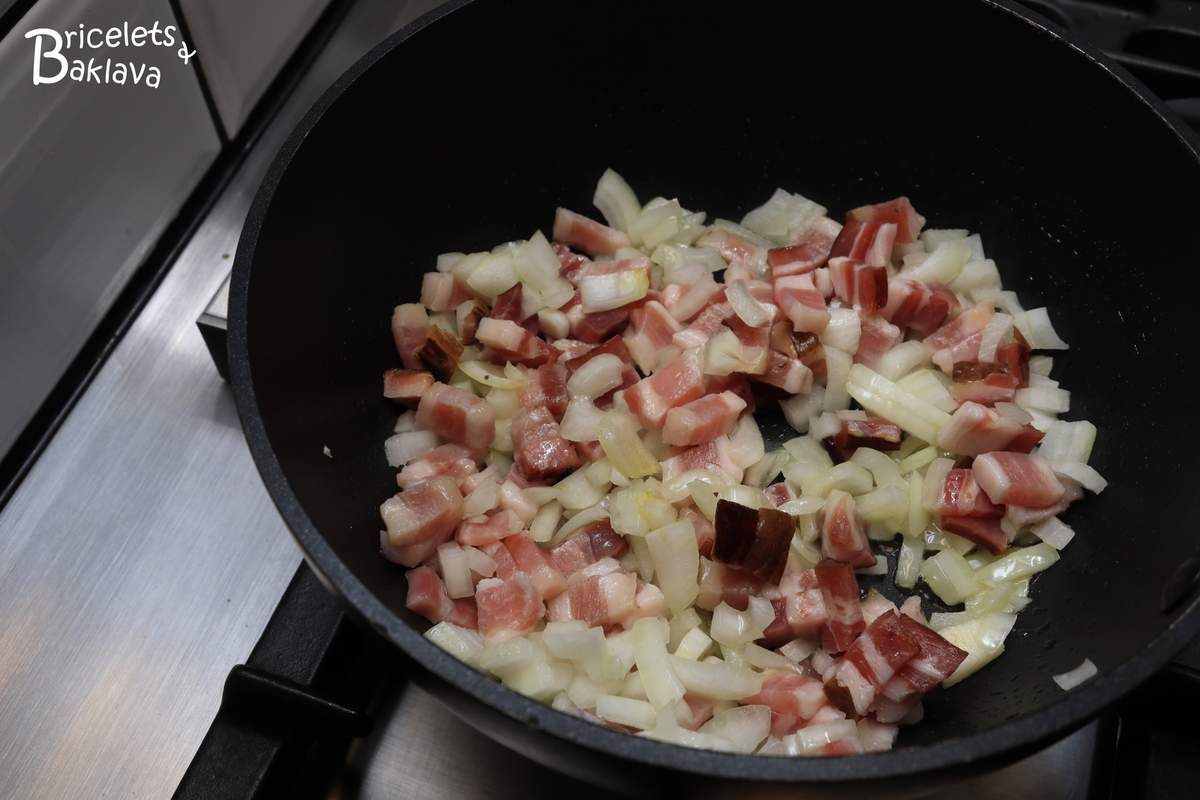 Dans une poêle, avec un peu d’huile, faire revenir doucement les oignons émincés et les lardons. Les égoutter dans une passoire et laisser refroidir.