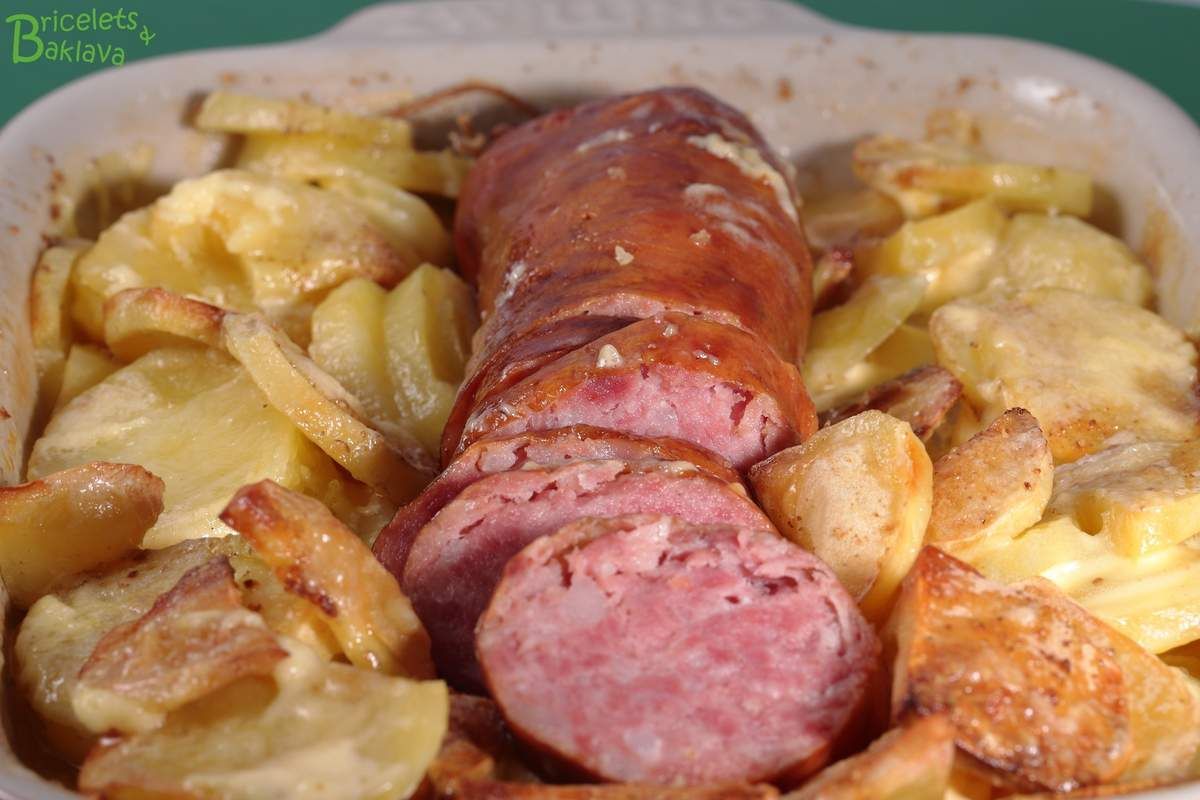 Jacques Montandon était neuchâtelois, son accent ne pouvait le trahir, et il nous avait alors présenté la recette de son gratin au saucisson. Je n’ai pas de document écrit de cette recette mais elle est incrustée dans ma cervelle car je l’ai réalisée à maintes reprises tellement c’est bon. Vu l’origine de Maître Jacques, je suppose que son saucisson était neuchâtelois, un peu différent du saucisson vaudois car poussé dans un boyau de bœuf calibré et épicé différemment. Mais cela n’a pas d’importance, le principe de la recette reste le même. Pour la recette qui suit j’ai utilisé un saucisson vaudois.
