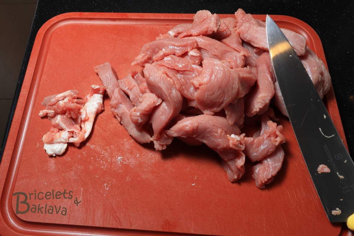 Débiter la viande de veau en lanières et enlever les peaux et les tendons s'il y a lieu. Ici c'est un casi.