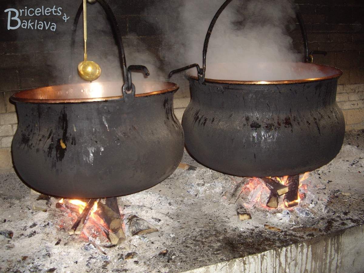 Le vin cuit (ou raisiné) n’a rien à voir avec le vin, c’est une réduction de jus de poires ou de pommes douces qui nécessite environ 24 heures de cuisson. On peu le réaliser chez soi dans sa cuisine mais habituellement la cuisson se fait sur l’âtre, dans des chaudières de cuivre ou de laiton pouvant contenir plus de 200 litres et ces moments donnent lieu à de grandes réunions festives où les habitants se relaient toute la nuit pour brasser, surveiller, alimenter les feux et finalement couler le précieux liquide dans des bocaux. Il faut au départ 150 kg de fruits qui, une fois pressés donneront 100 litres de jus de fruits pour obtenir au final 10 litres de vin cuit.