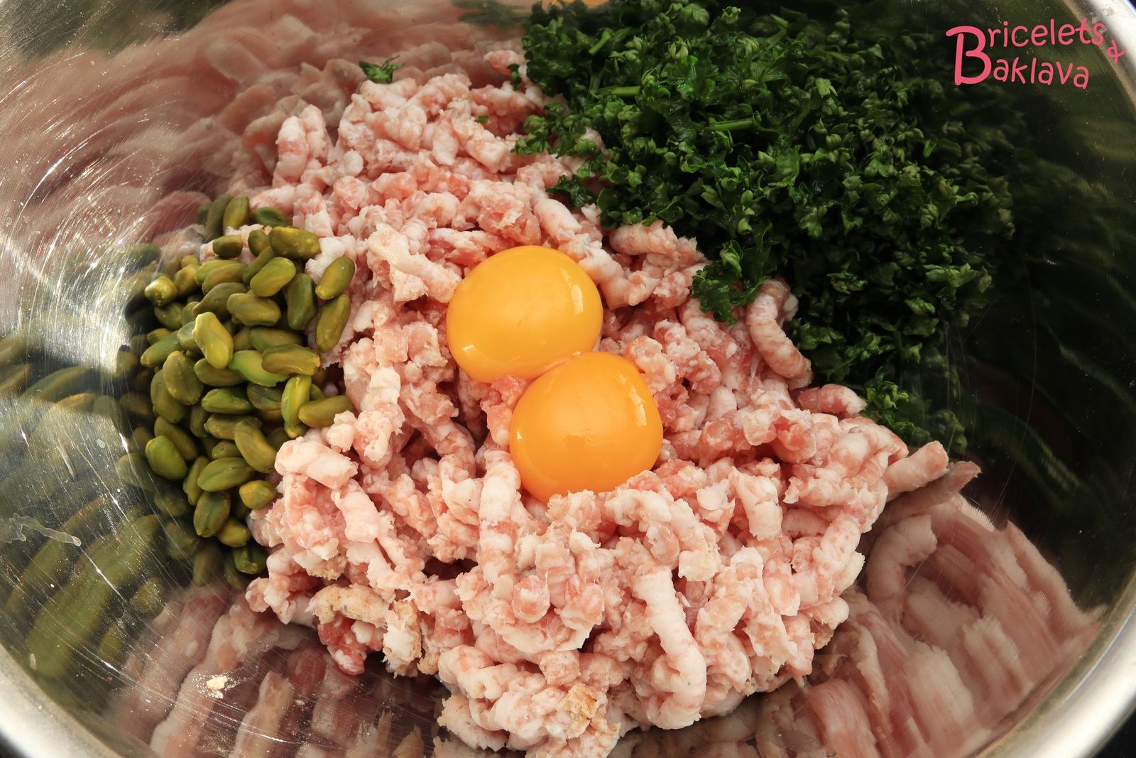 Transvaser ce hachis dans un saladier, ajouter les épices, les jaunes d’œuf, le persil, les pistaches ainsi que l’alcool.