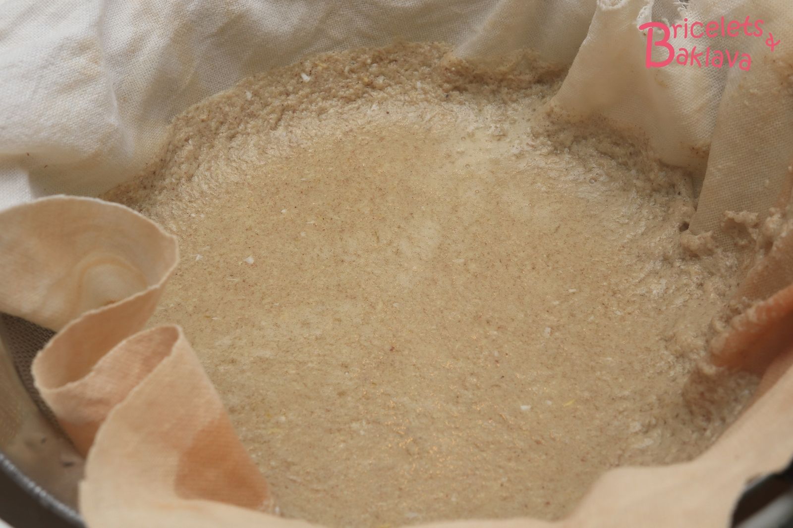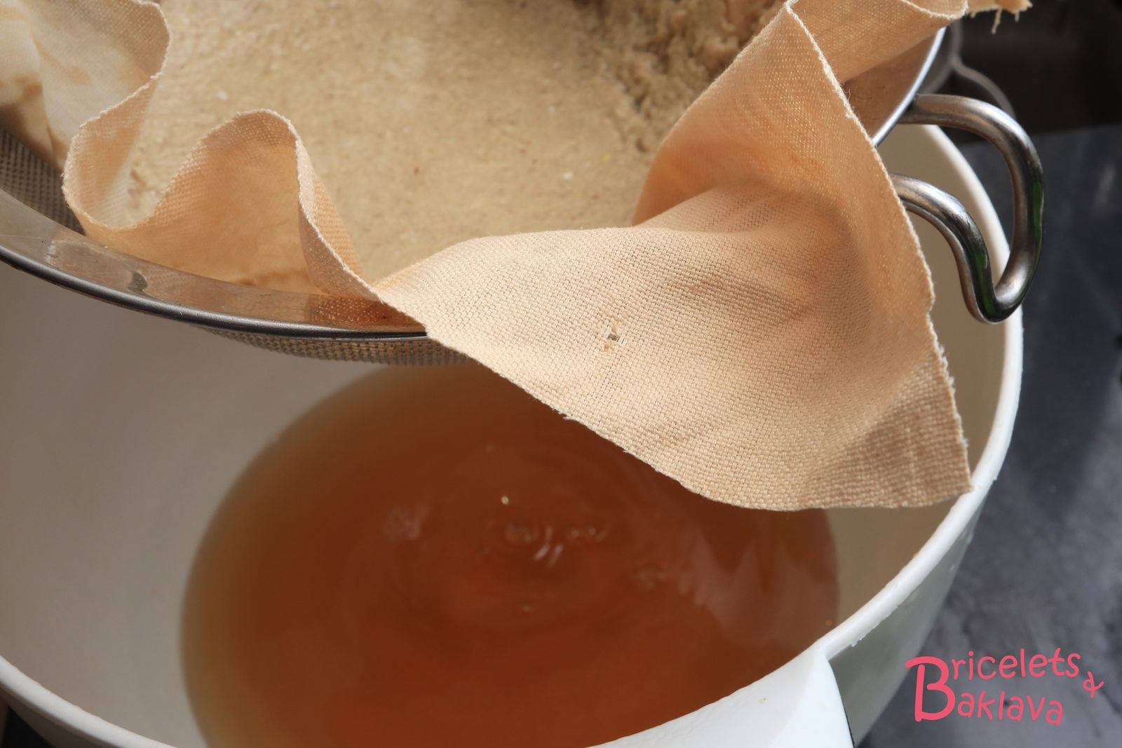 Reprendre la grande passoire, la couvrir d’un tissu mousseline et y verser le bouillon,
