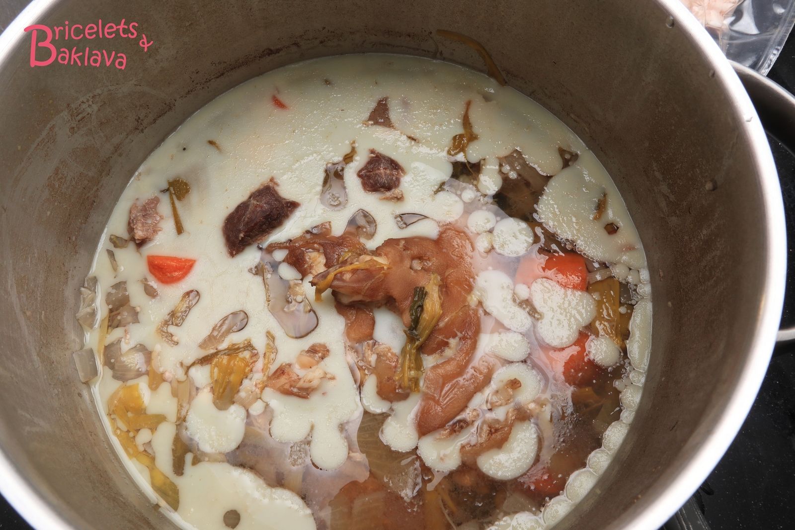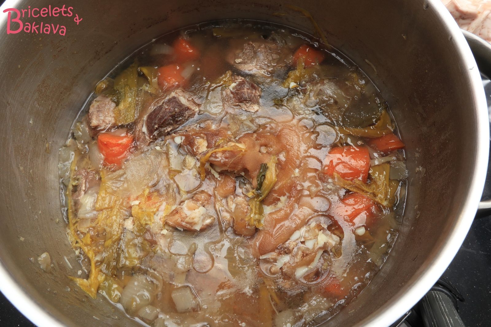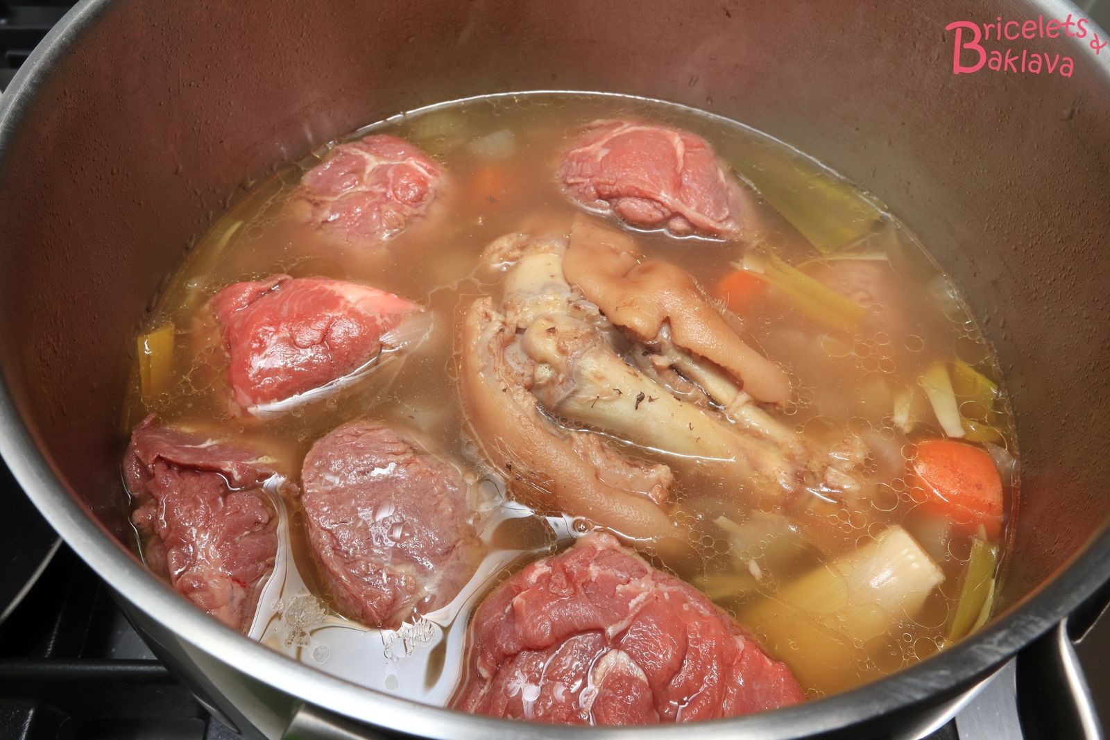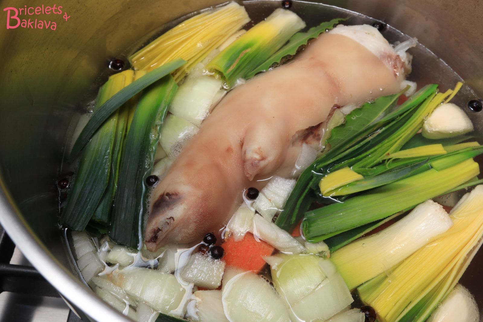 Sortir le pied, jeter l’eau, remettre 1 ½ litre d’eau fraîche dans la marmite, le vin blanc, le pied ainsi que tous les ingrédients sauf les joues de porc.
