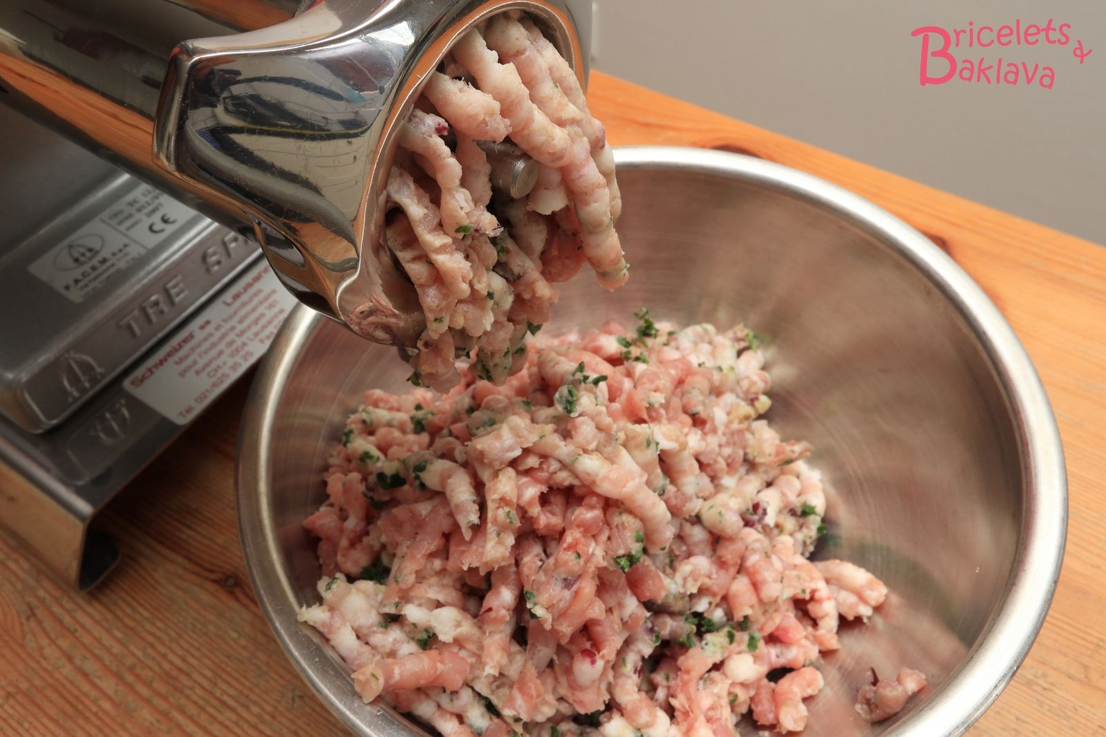 Passer l’échine et le lard de bajoue au hachoir muni d’une grille de 8 mm.