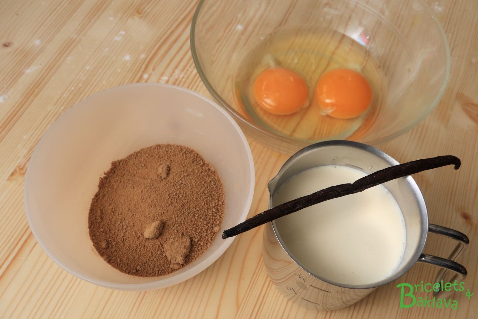 Dans un saladier, battre les œufs avec le restant du sucre, gratter la demi gousse de vanille et ajouter, verser encore la crème et fouetter le tout.