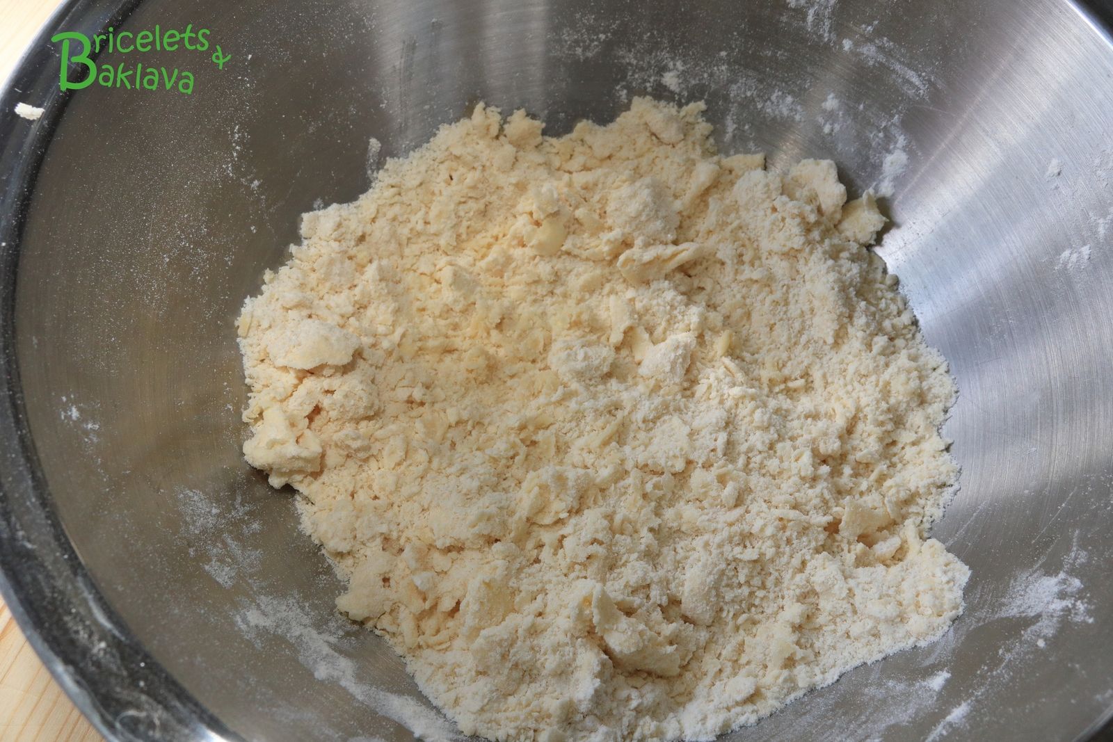 Dans un grand bol, mélanger la farine, le sucre et le sel, ajouter le beurre et malaxer entre vos doigts pour en faire une masse granuleuse.