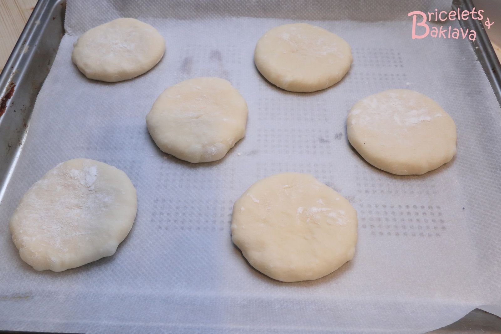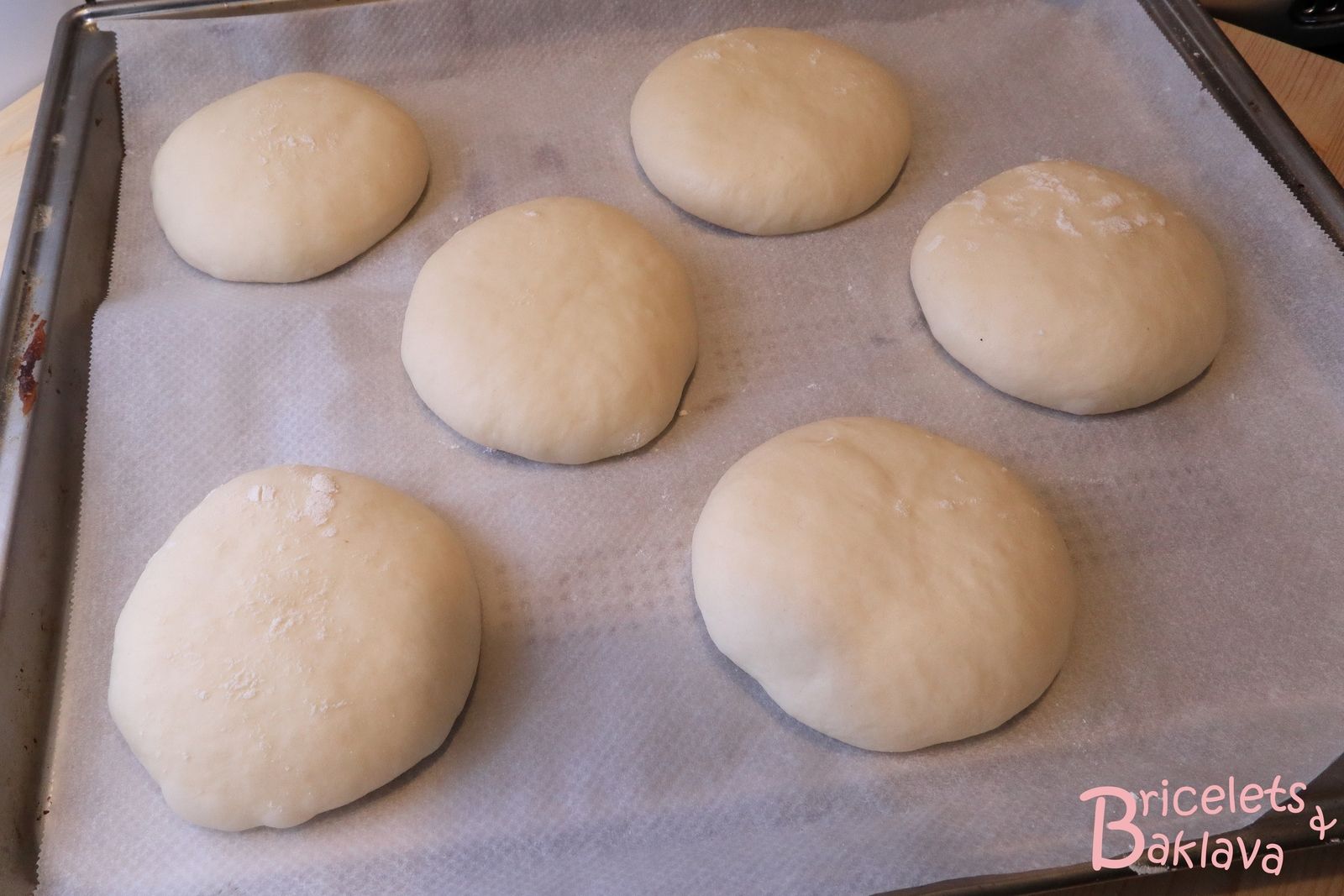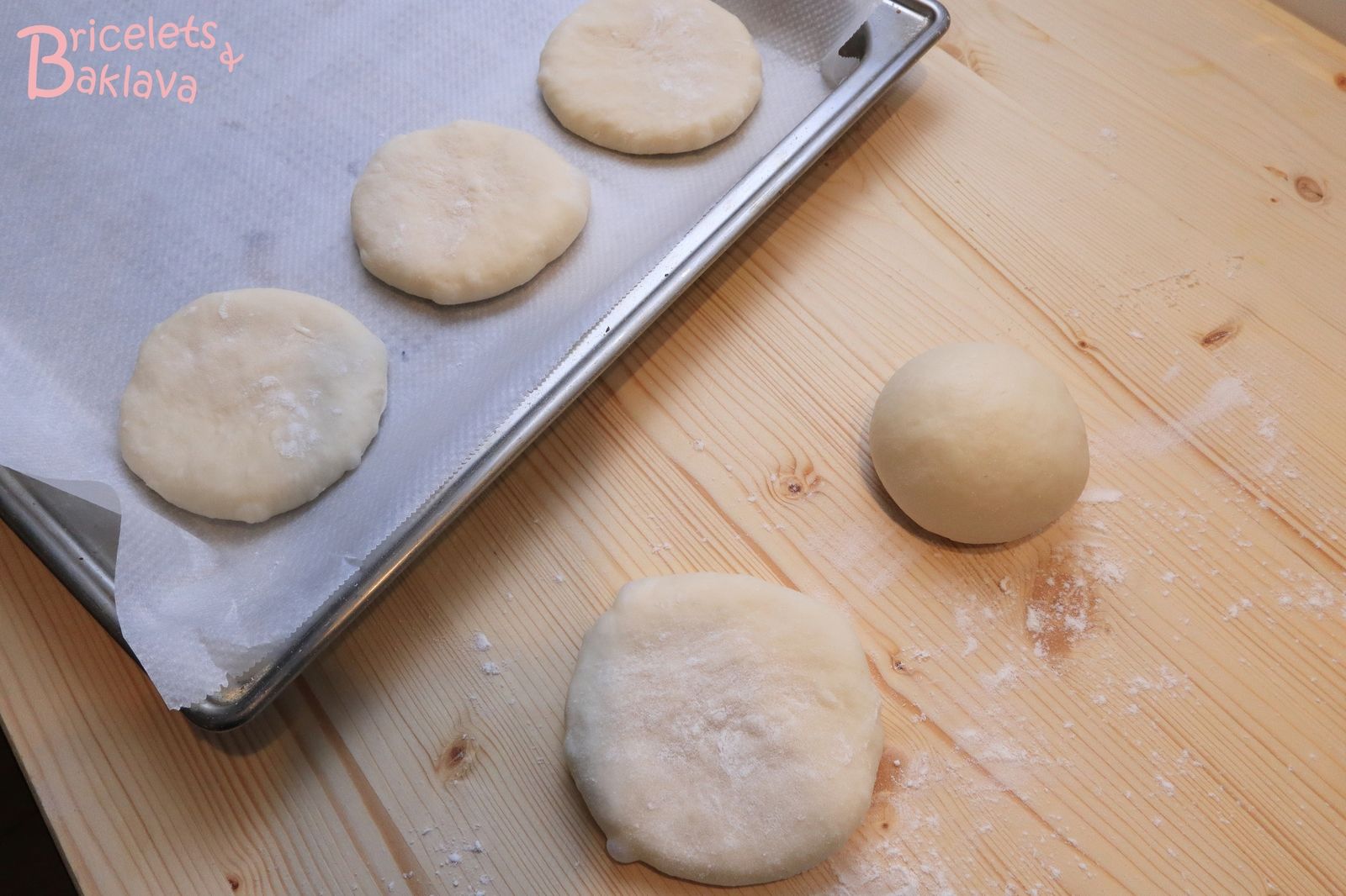 Reprendre les pâtons et avec la paume de la main et un peu de farine, les aplatir pour en faire des disques d’environ 8 à 9 cm de diamètre, pour une fois cuits obtenir des pains de 10 cm.