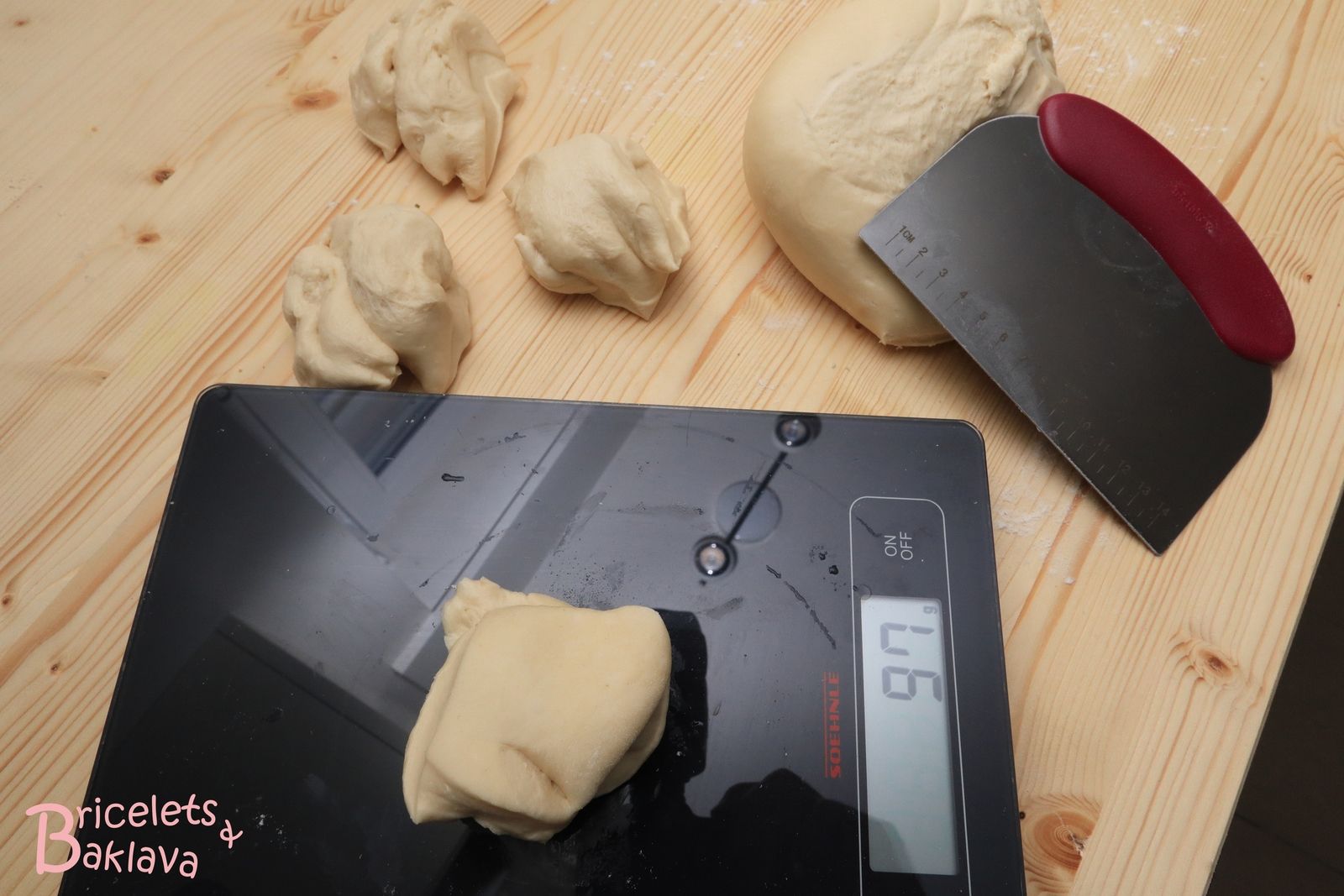 Après deux heures, diviser la pâte en 10 portions de 90 grammes