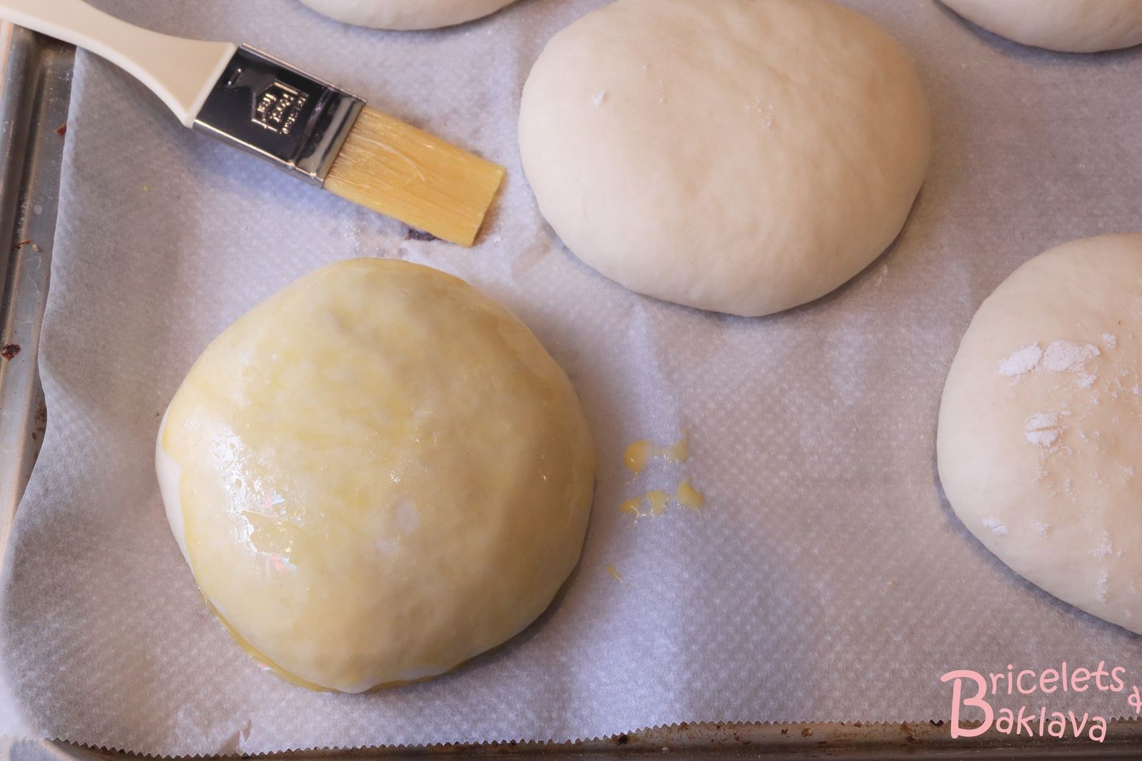 Une fois les pains bien levés, très très délicatement les dorer avec le jaune d’œuf mélangé à du lait.