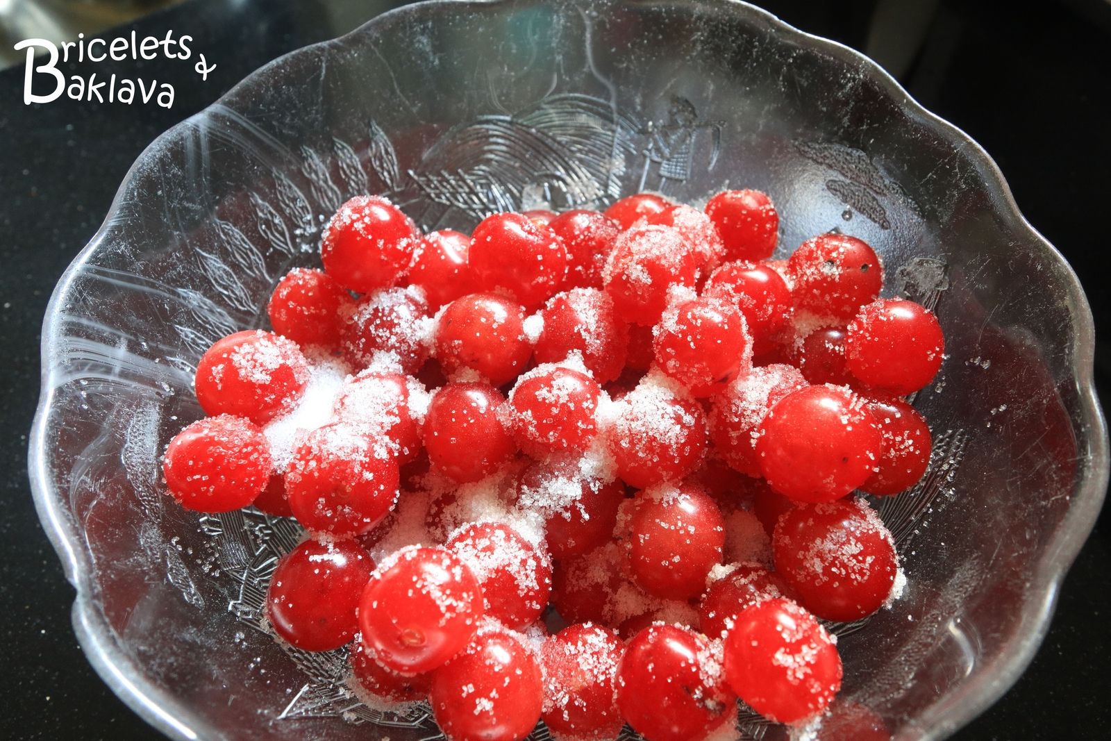 Dénoyauter les griottes et les mettre dans un bol, saupoudrer avec 20 g de sucre, mélanger et réserver pour une bonne heure, elles vont ainsi rendre leur excédent d’eau.