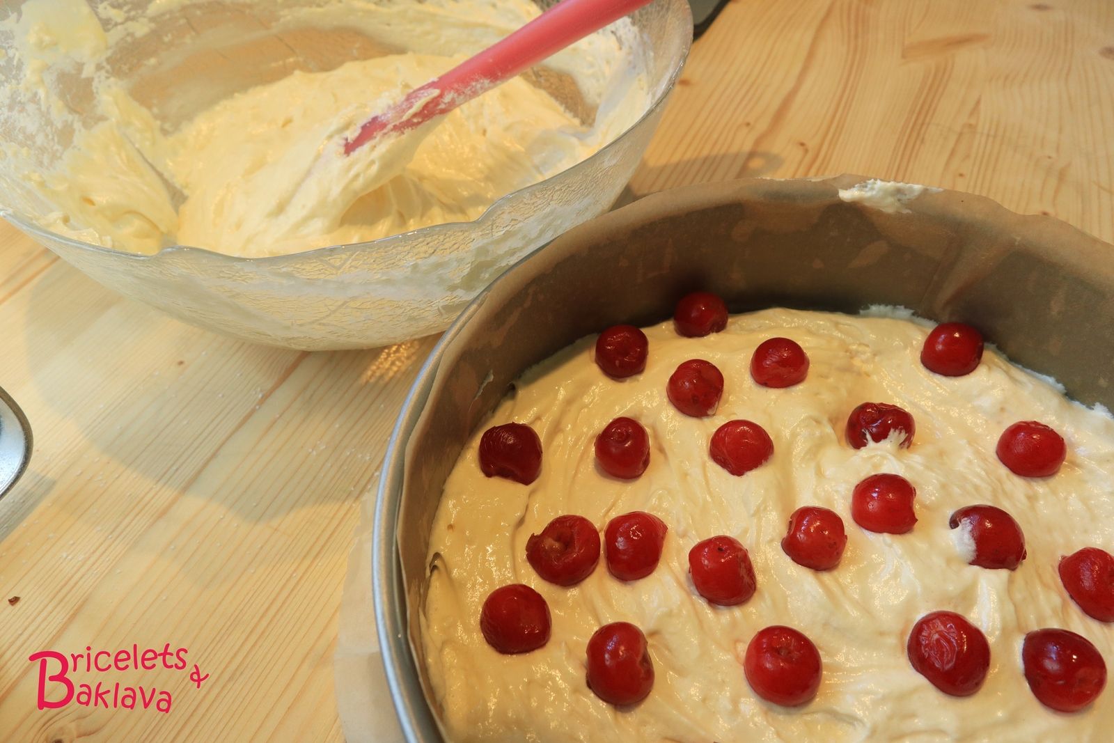 Verser le restant de la crème et répartir le solde des griottes et enfourner de suite à 200°C.