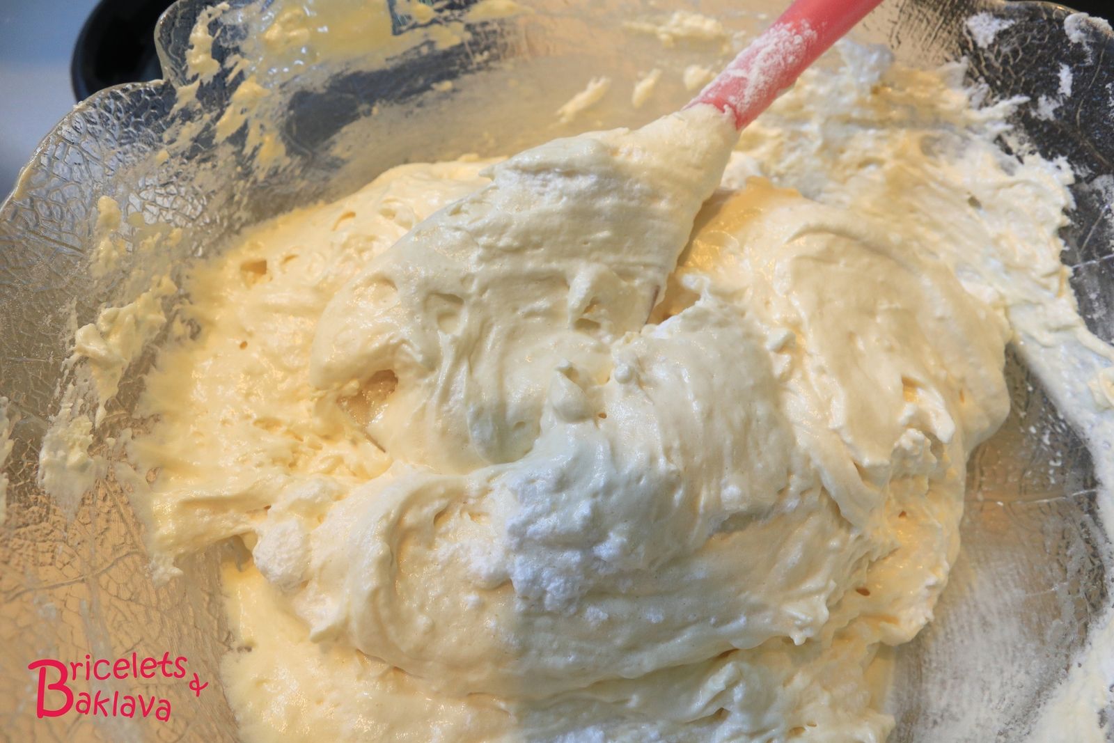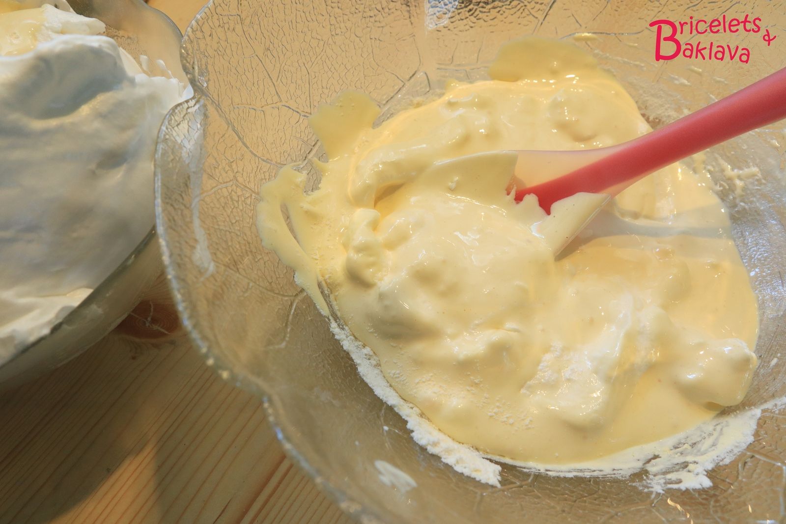 Ensuite on va incorporer la farine ainsi que les blancs d’œuf aux jaunes. Pour ce faire, à l’aide d’une spatule en silicone, saupoudrer un peu de farine et ajouter une cuillerée de blanc et brasser très délicatement.