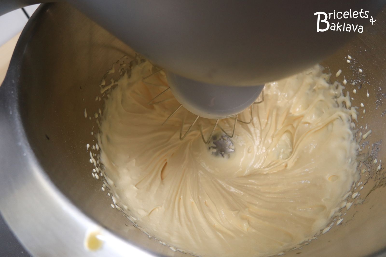 et battre jusqu’à ce que le mélange blanchisse et fasse le ruban (environ 5 minutes).