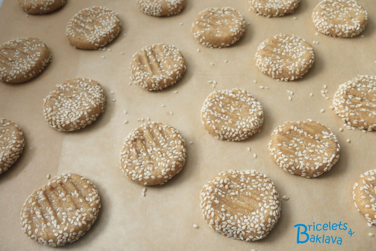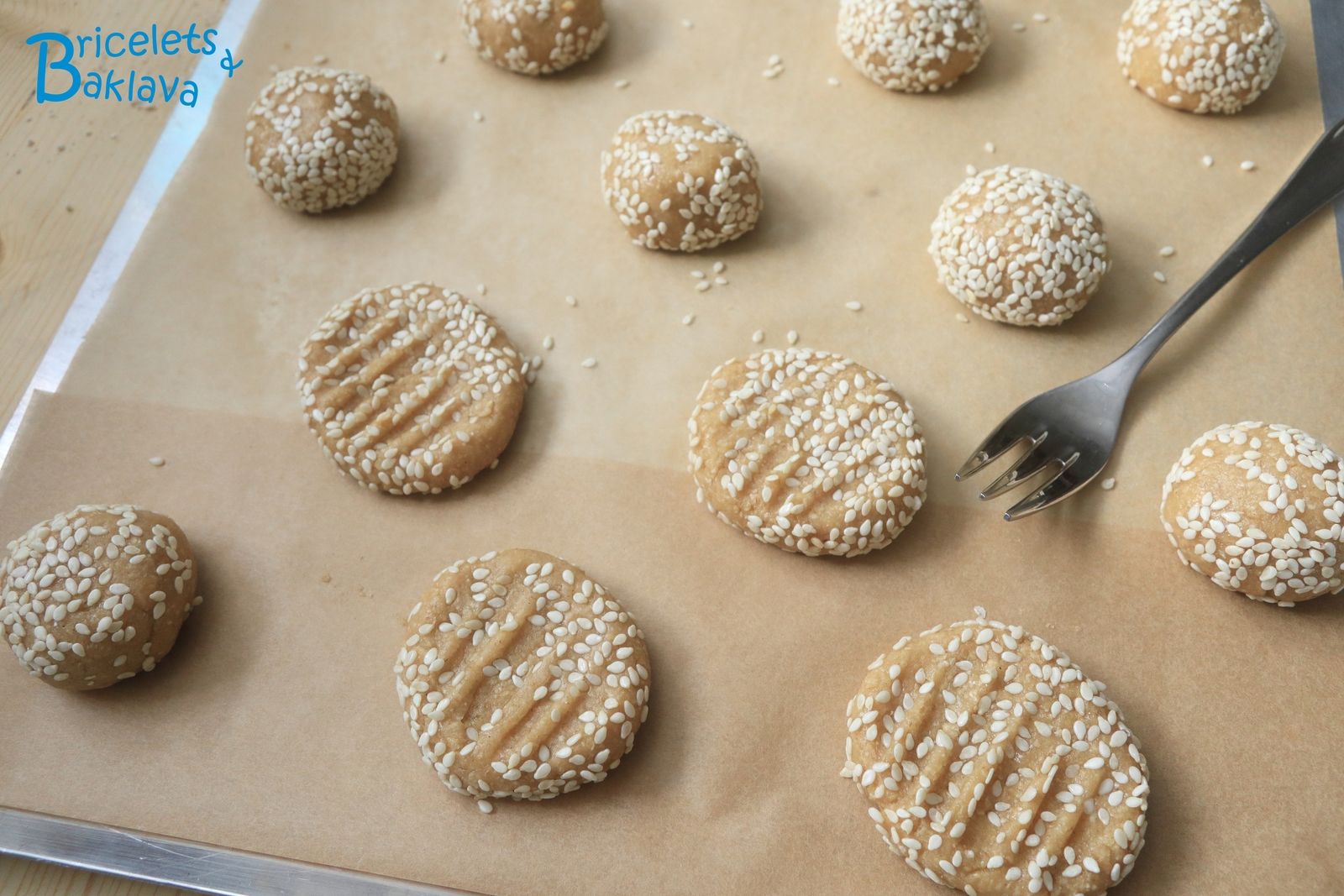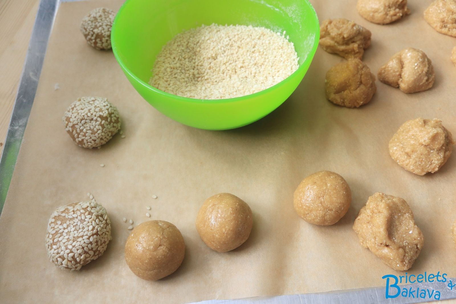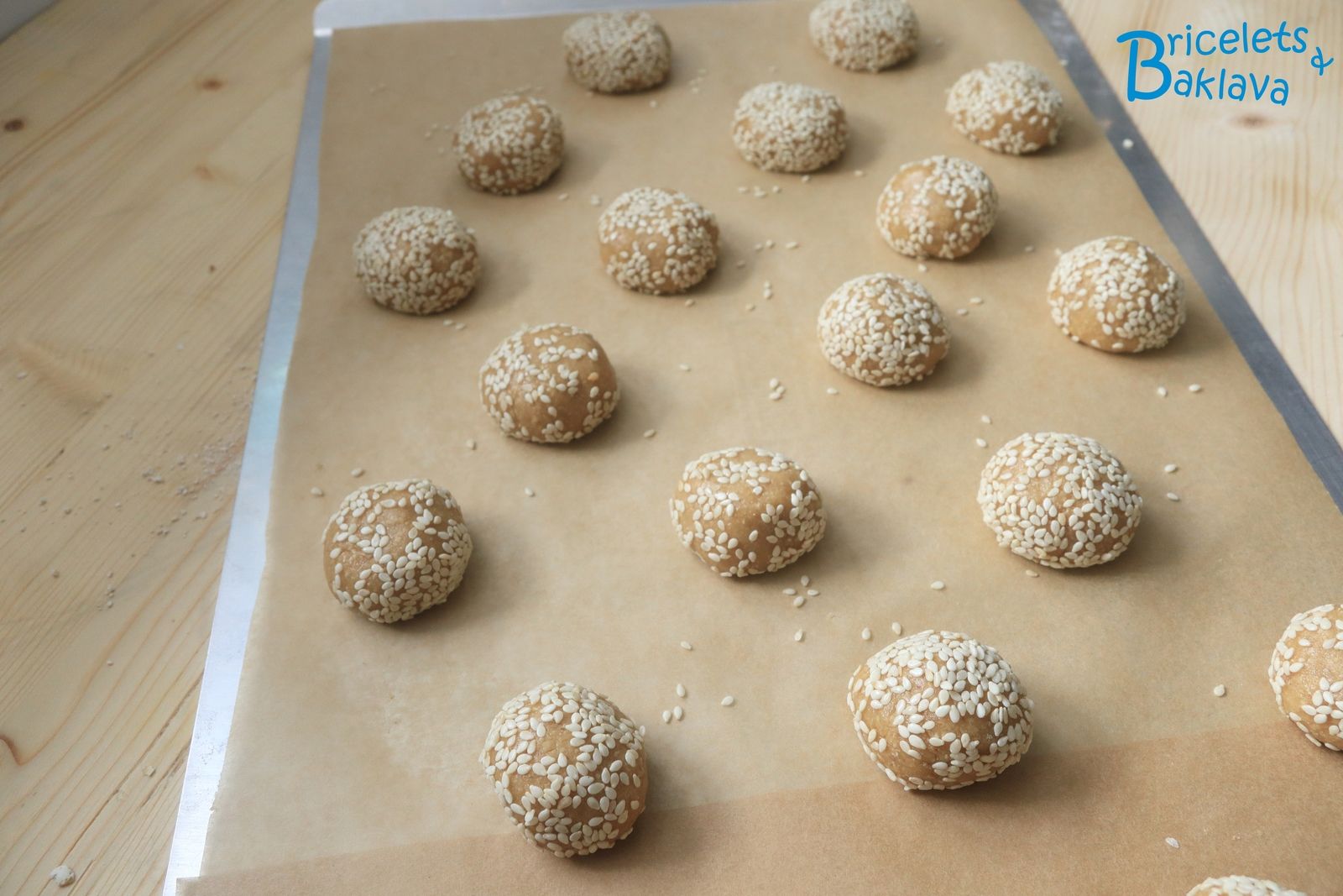 Les rouler dans des graines de sésame puis les disposer sur une plaque de cuisson recouverte de papier sulfurisé. Bien les espacer car les biscuits vont s’étendre lors de la cuisson.