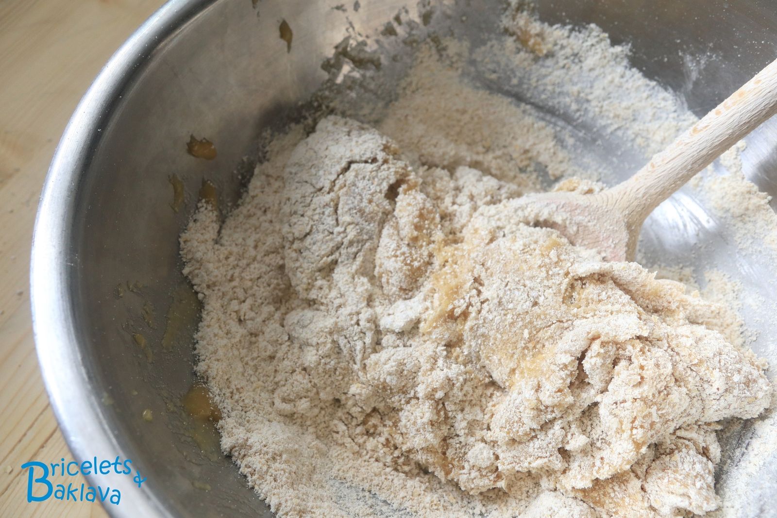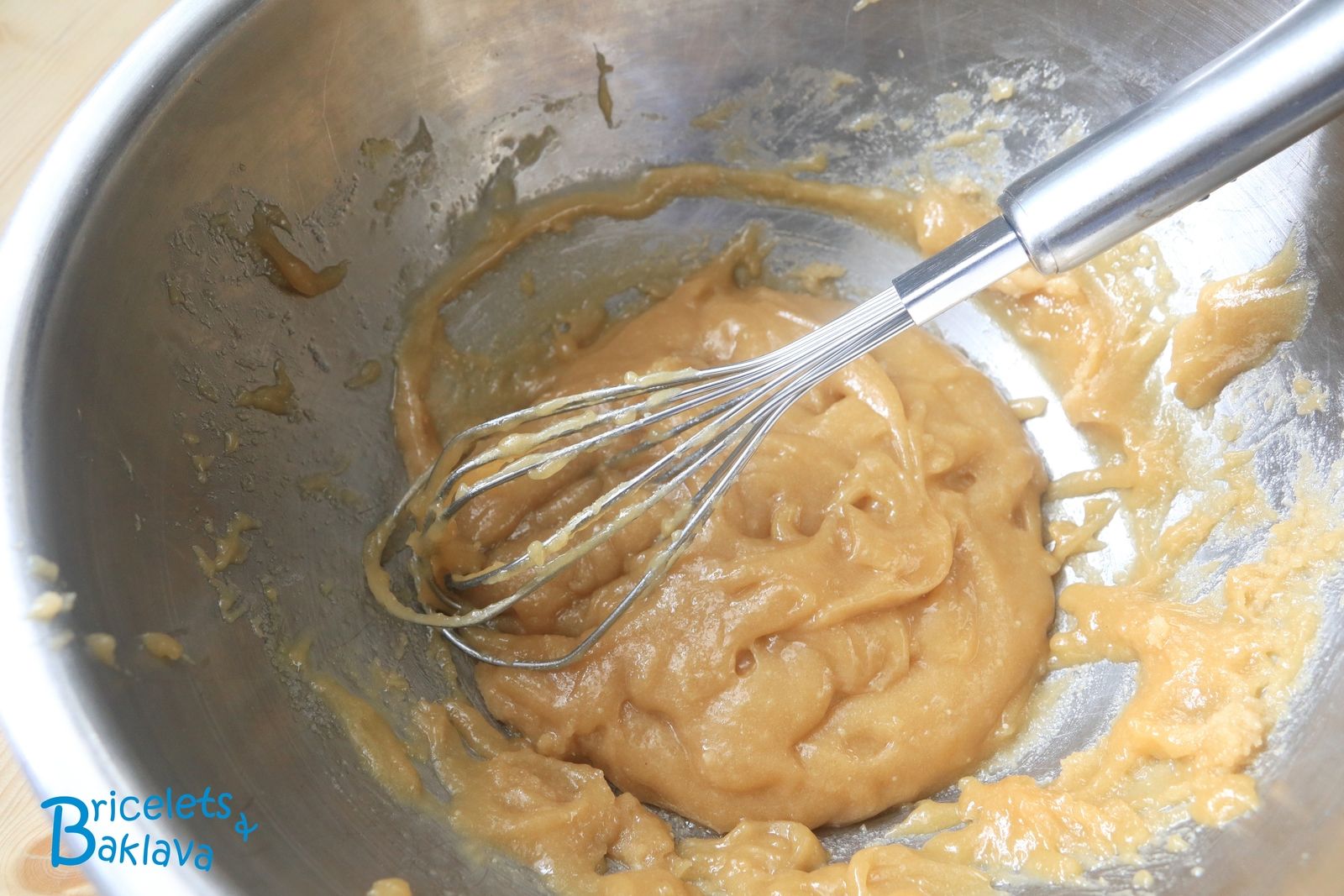 Au contact du sucre et de l’œuf le tahine va s’épaissir instantanément pour devenir compact et collant, c’est normal, il faudra brasser vigoureusement pour en faire une pâte bien amalgamée.