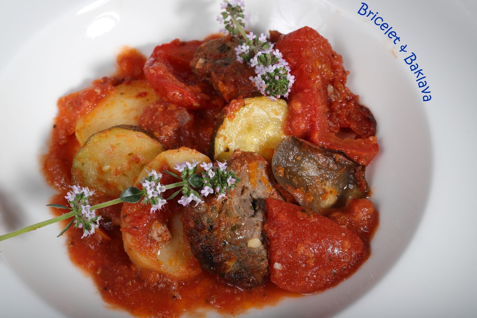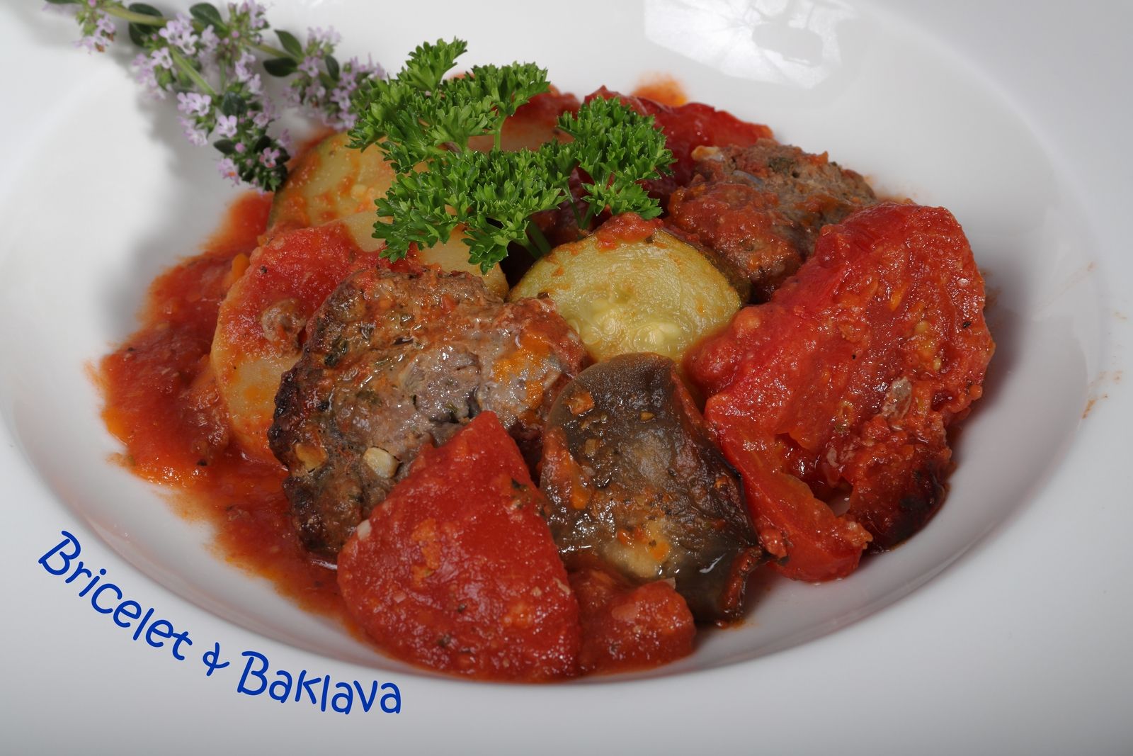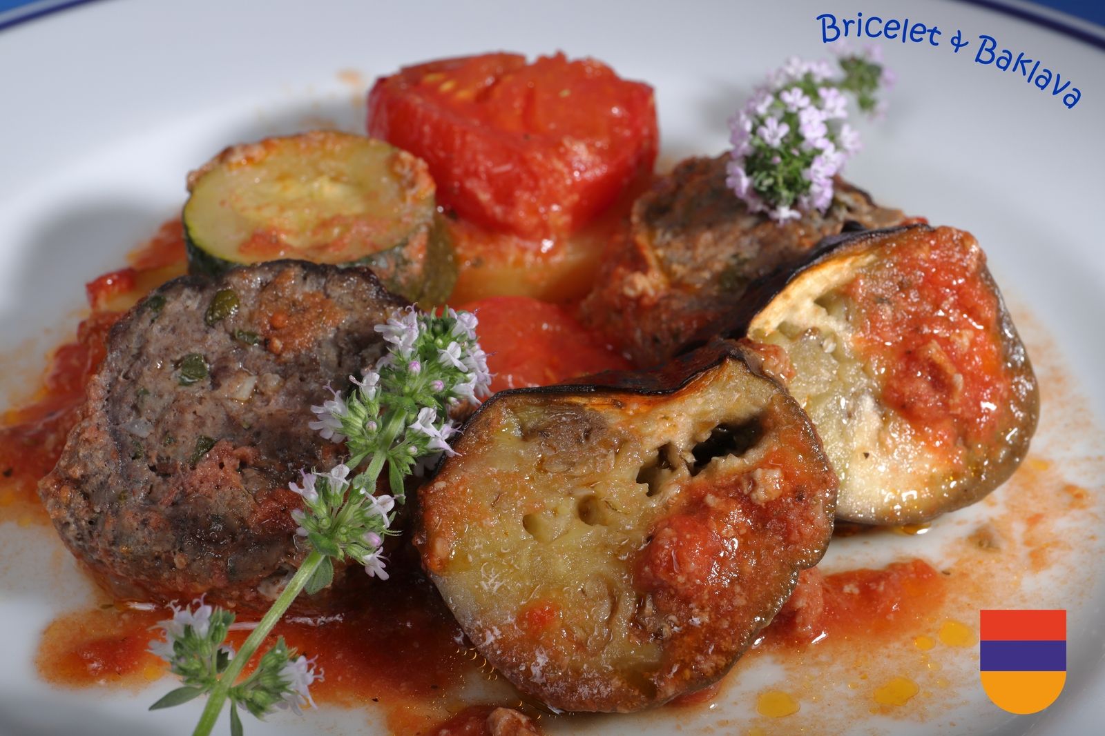 Voici un plat arménien pas très connu et je ne sais pas si cette recette est toujours pratiquée de nos jours en Arménie. Je l’ai dégottée dans un vieux livre de cuisine arménienne qui appartenait à ma mère et après un minutieux décryptage et quelques essais, j’en suis arrivé à cette conclusion : un plat vraiment exceptionnel qui faut absolument tester une fois. Les arômes des légumes qui se marient à ceux de la viande et qui imprègnent le jus de la tomate avec ce petit goût de grillé, il n’y a qu’un mot, délicieux.