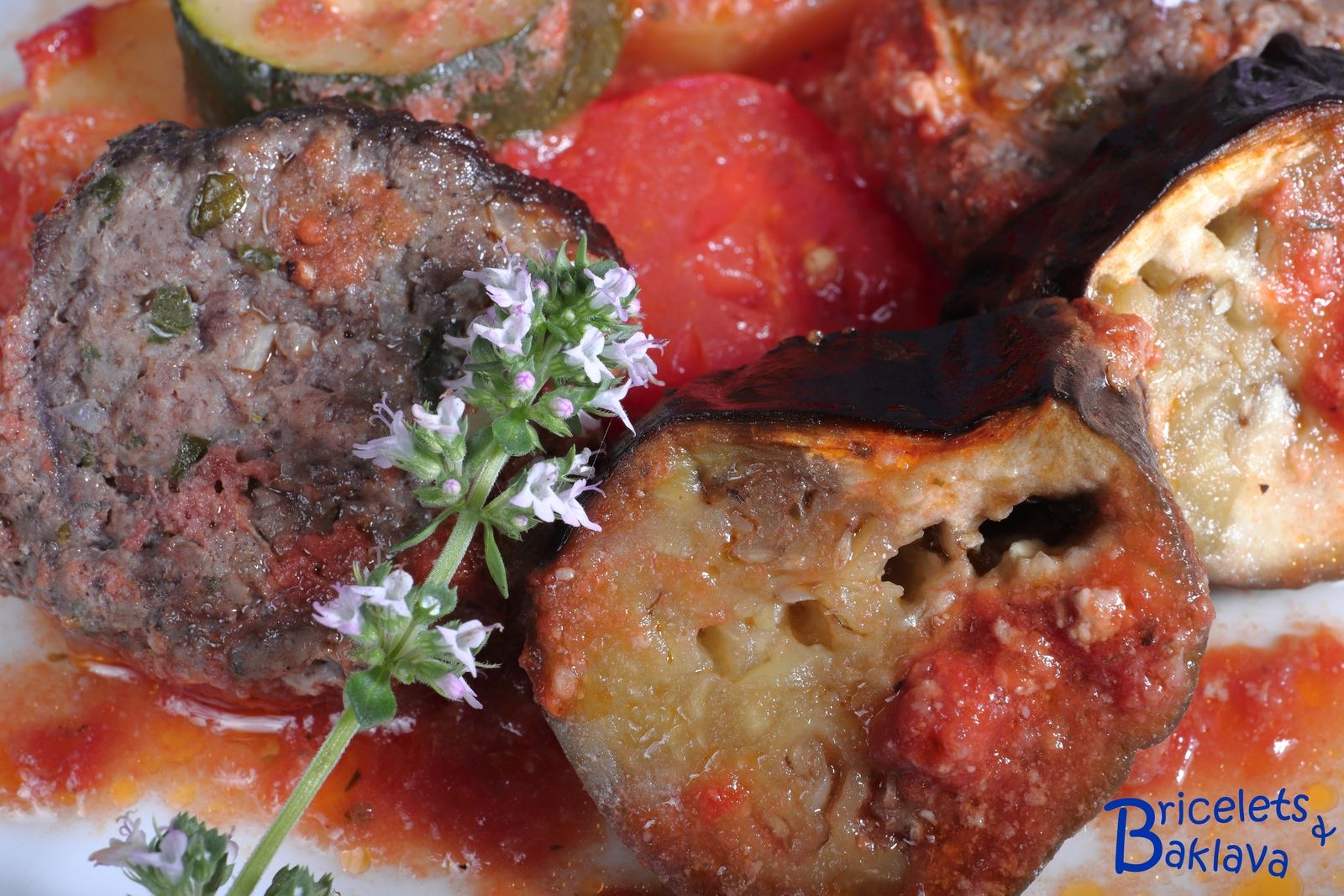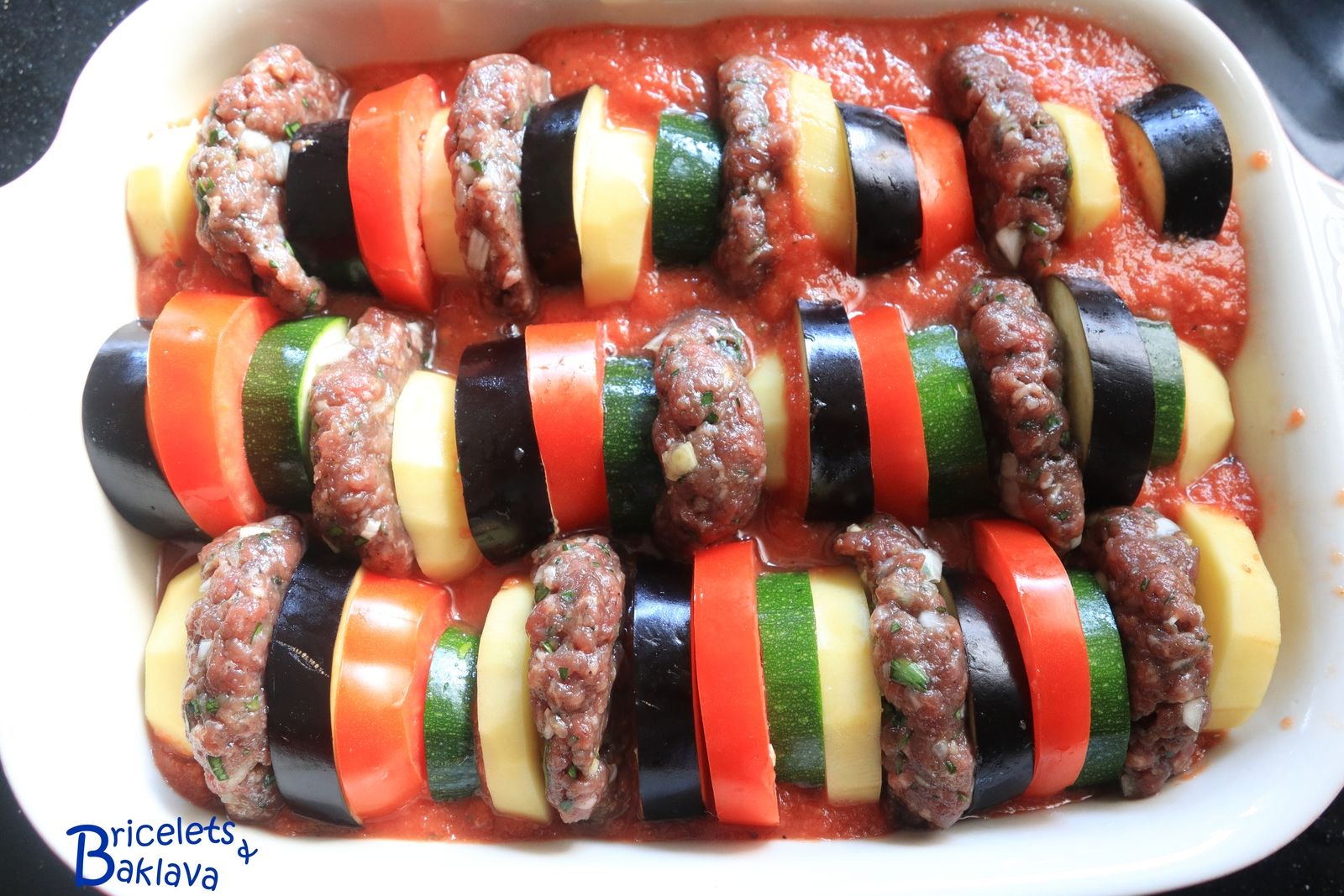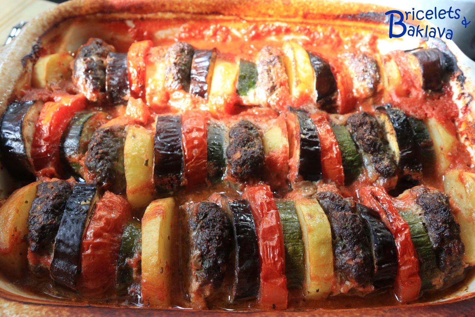 Dans le livre en question, la définition était : « Aubergines aux hamburgers ». Ici j’ai rebaptisé ce plat « Gratin de keuftés aux légumes ». Si vous avez d’autres idées ou tout bêtement le nom en arménien, je suis preneur.