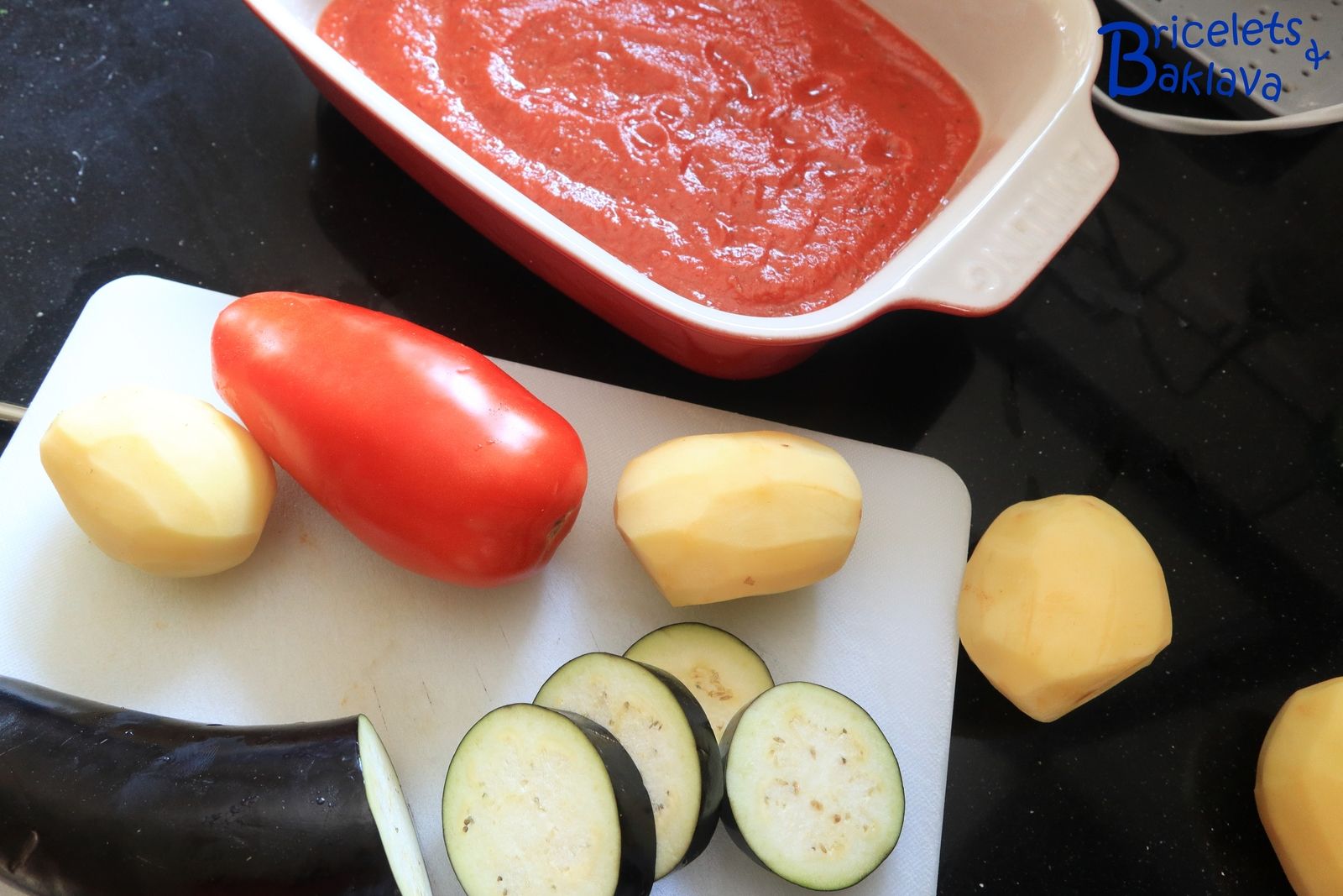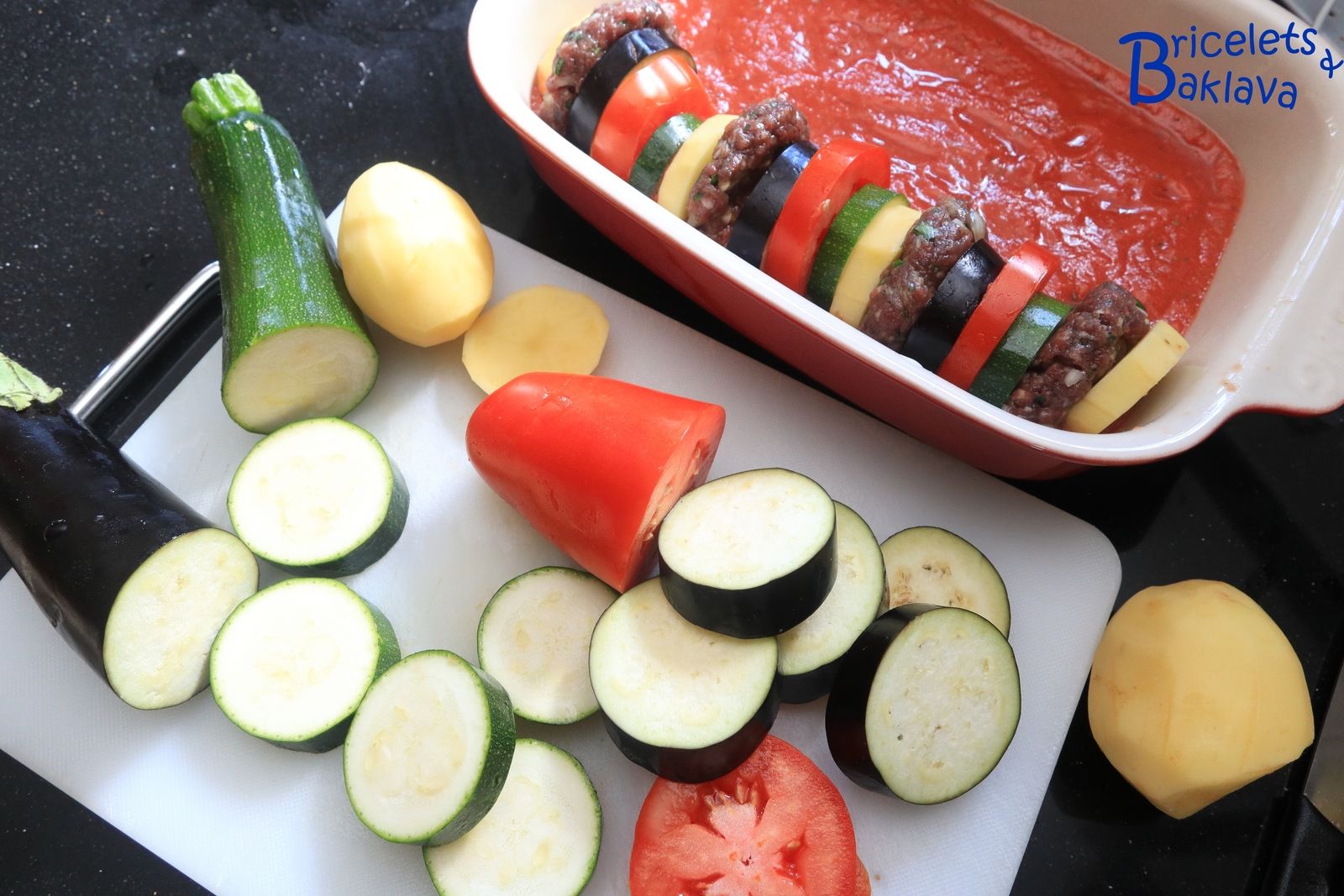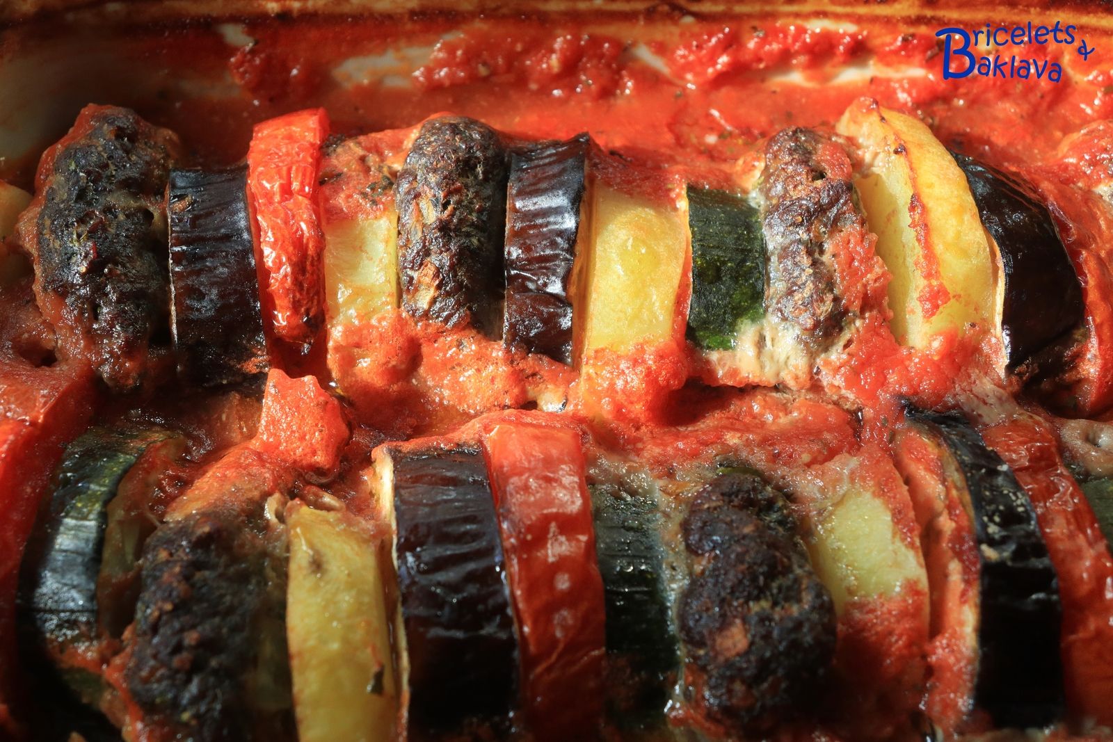 Dans le livre en question, la définition était : « Aubergines aux hamburgers ». Ici j’ai rebaptisé ce plat « Gratin de keuftés aux légumes ». Si vous avez d’autres idées ou tout bêtement le nom en arménien, je suis preneur.