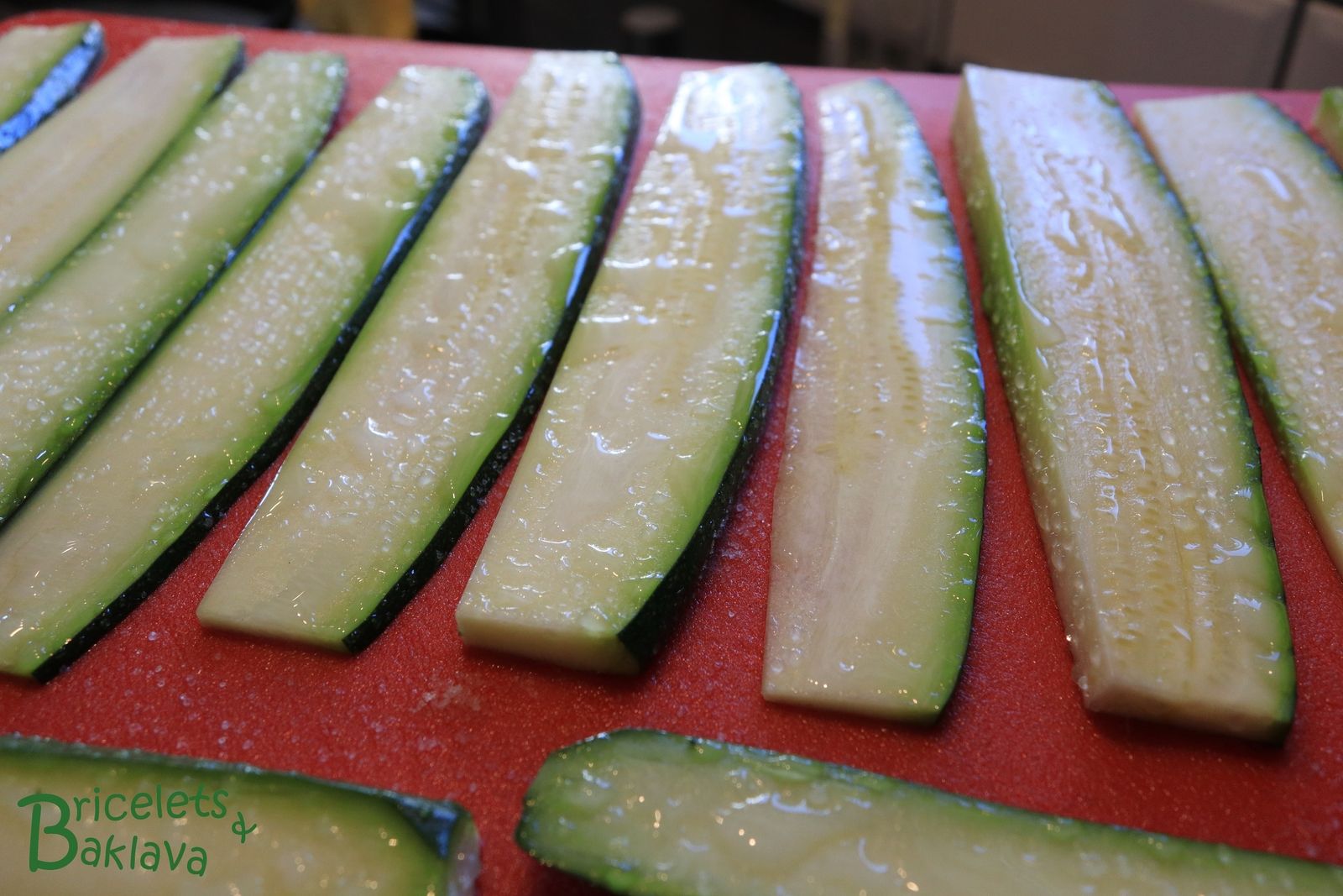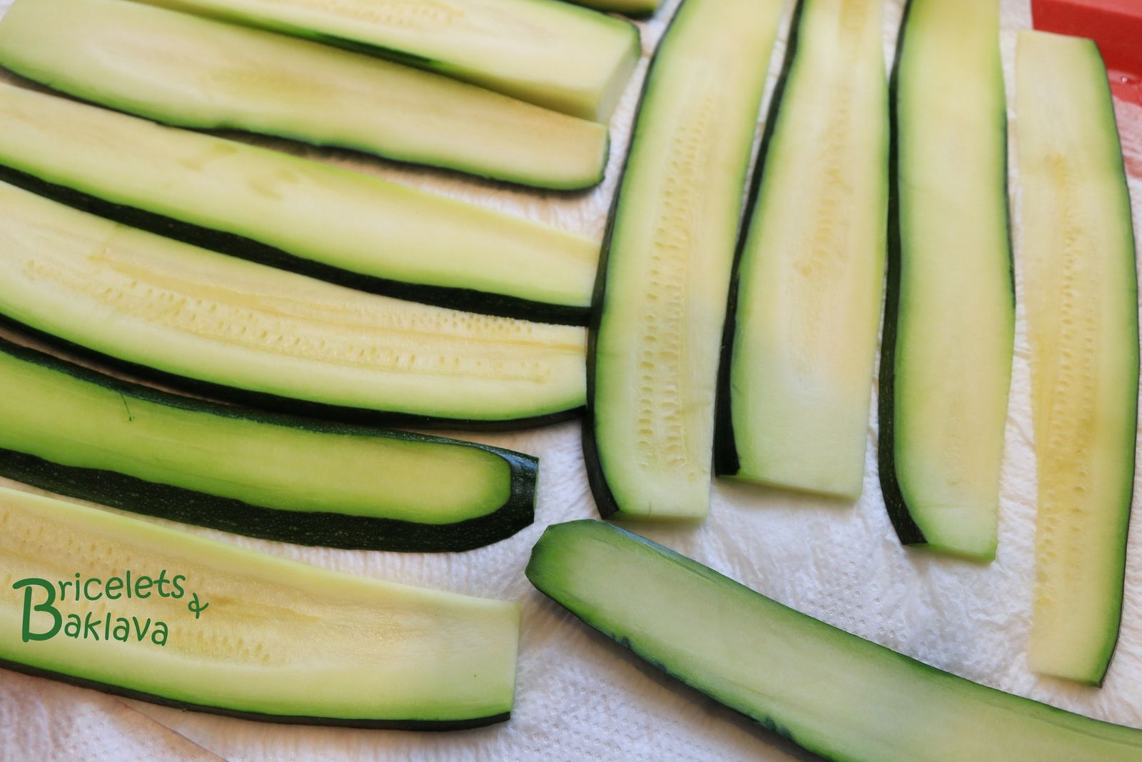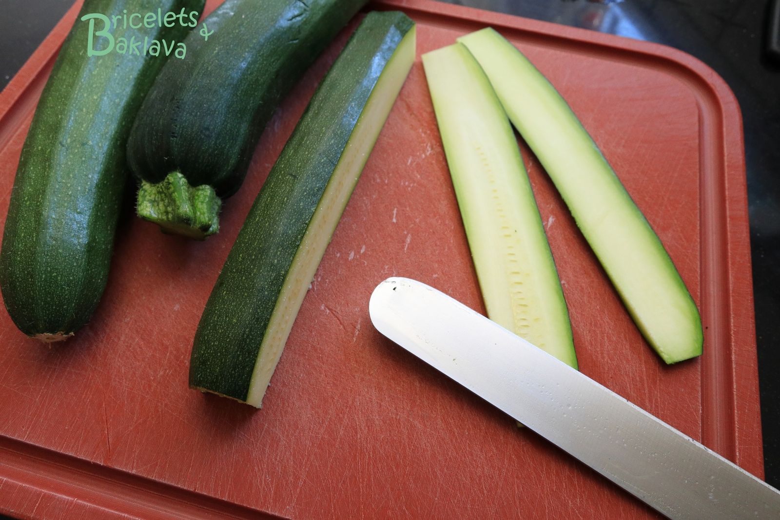 Avec un long couteau bien aiguisé, trancher les courgettes sur la longueur, à une épaisseur d’environ 5 mm.