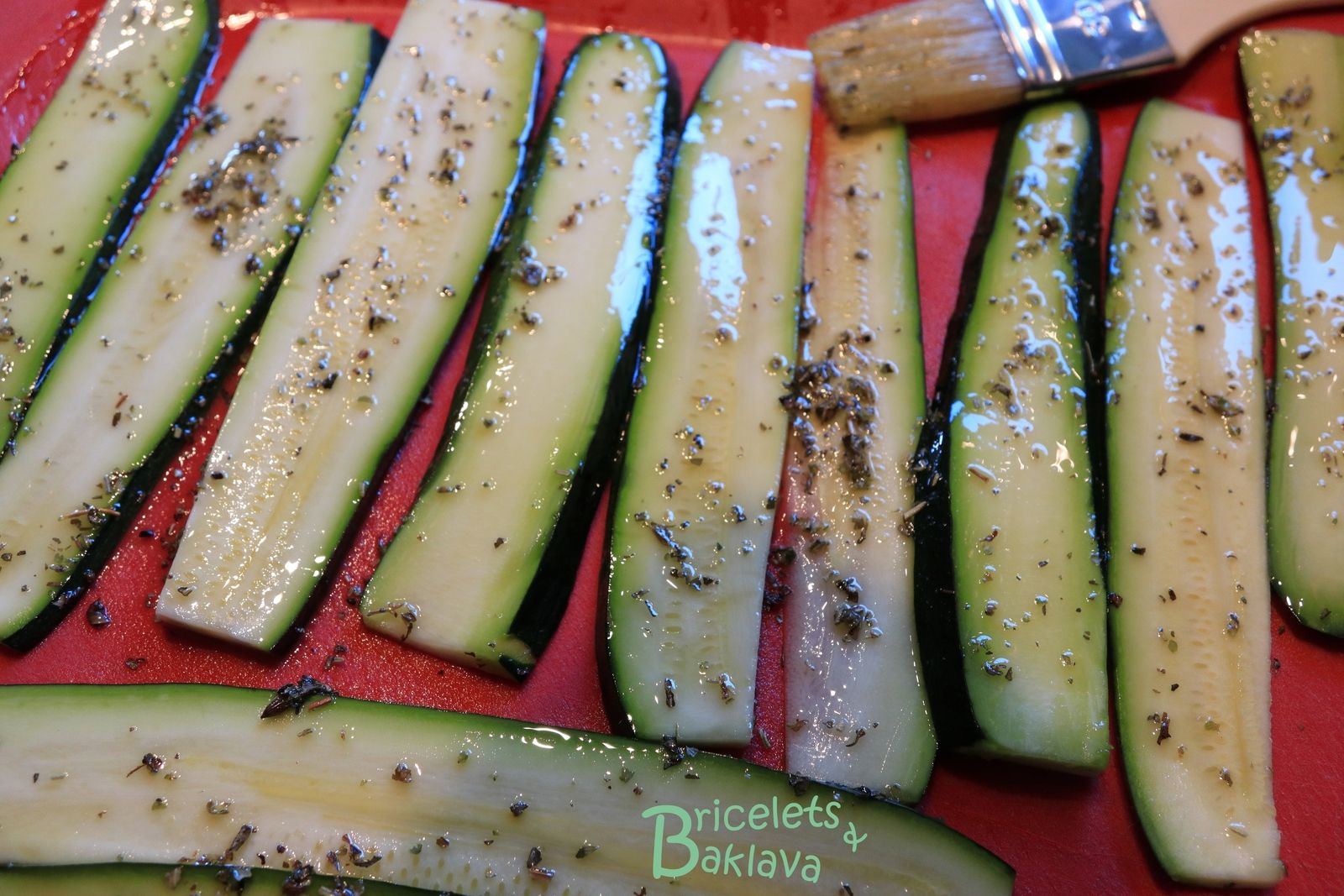 Dans un petit bol, mélanger l’huile d’olive avec les herbes de Provence et avec un pinceau, badigeonner les tranches de courgette, sur les deux faces.