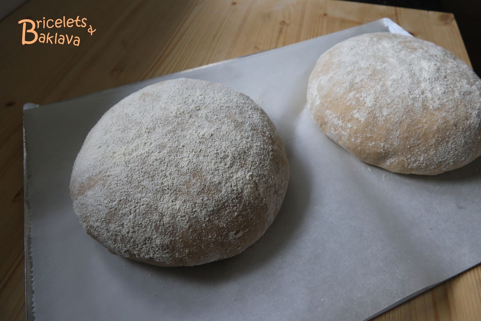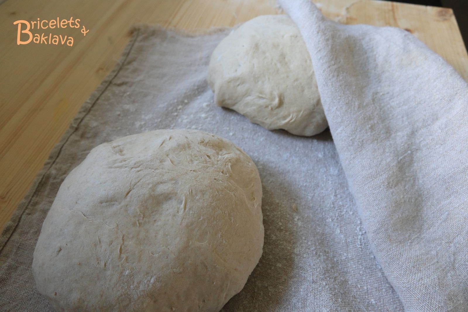 Sur le plan de travail, diviser la pâte en 2 pâtons et sans trop les manipuler, les façonner légèrement et très délicatement et les réserver sous un torchon pendant 10 minutes, c’est la détente.